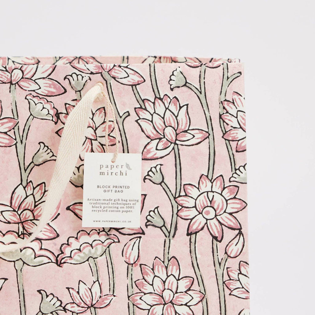 A beautiful selection of luxury block printed gift bags. Each one is made from strong 250gsm recycled cotton card paper in colours and designs complementing the gift wrap range. Every bag is hand block printed using traditional techniques making each piece a little work of art.
