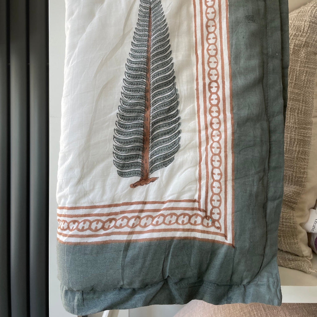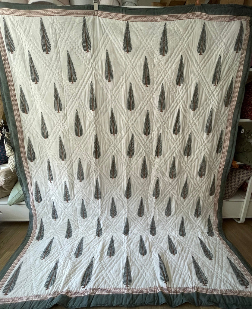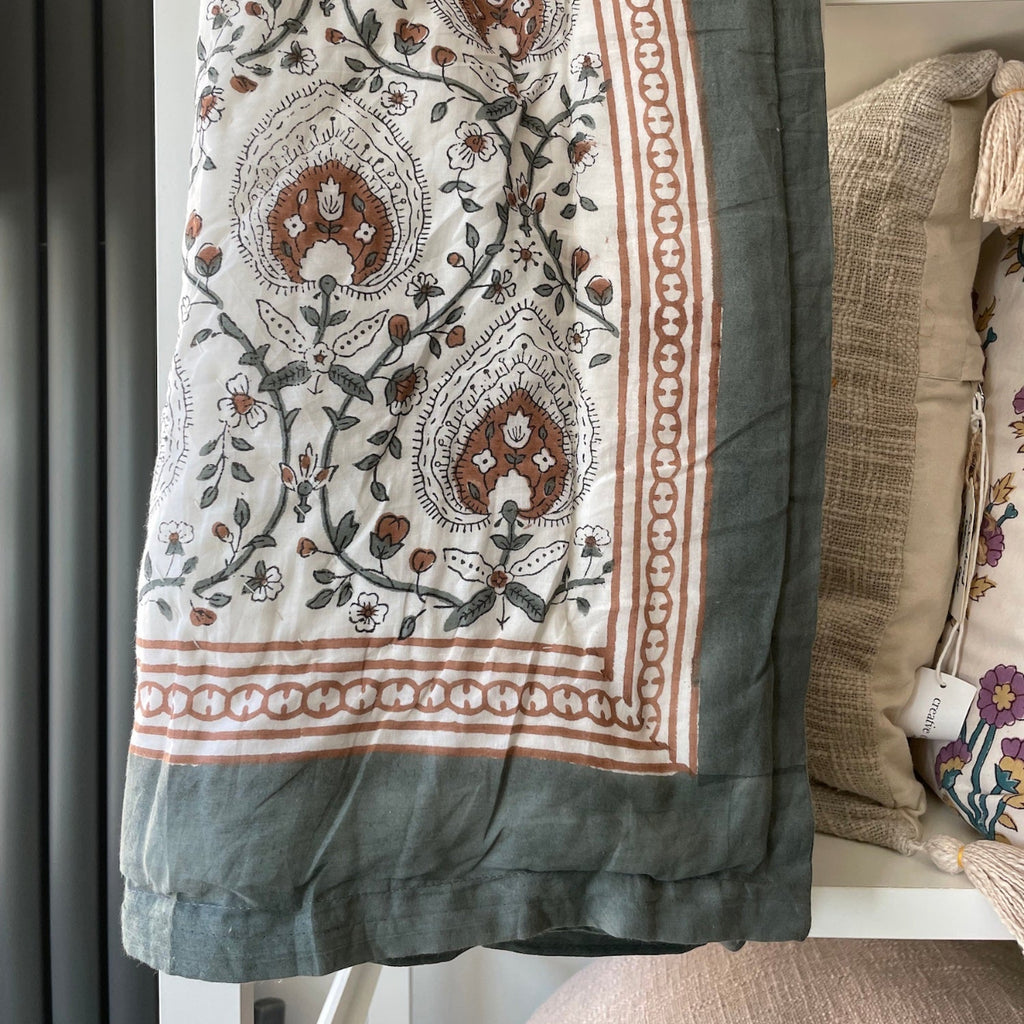 Gina I love this quilt. The colours are beautiful and it matches my bedroom perfectly. I also love the handmade quality of the block print. It’s really inspiring. I would like to have a go at making my own block print.