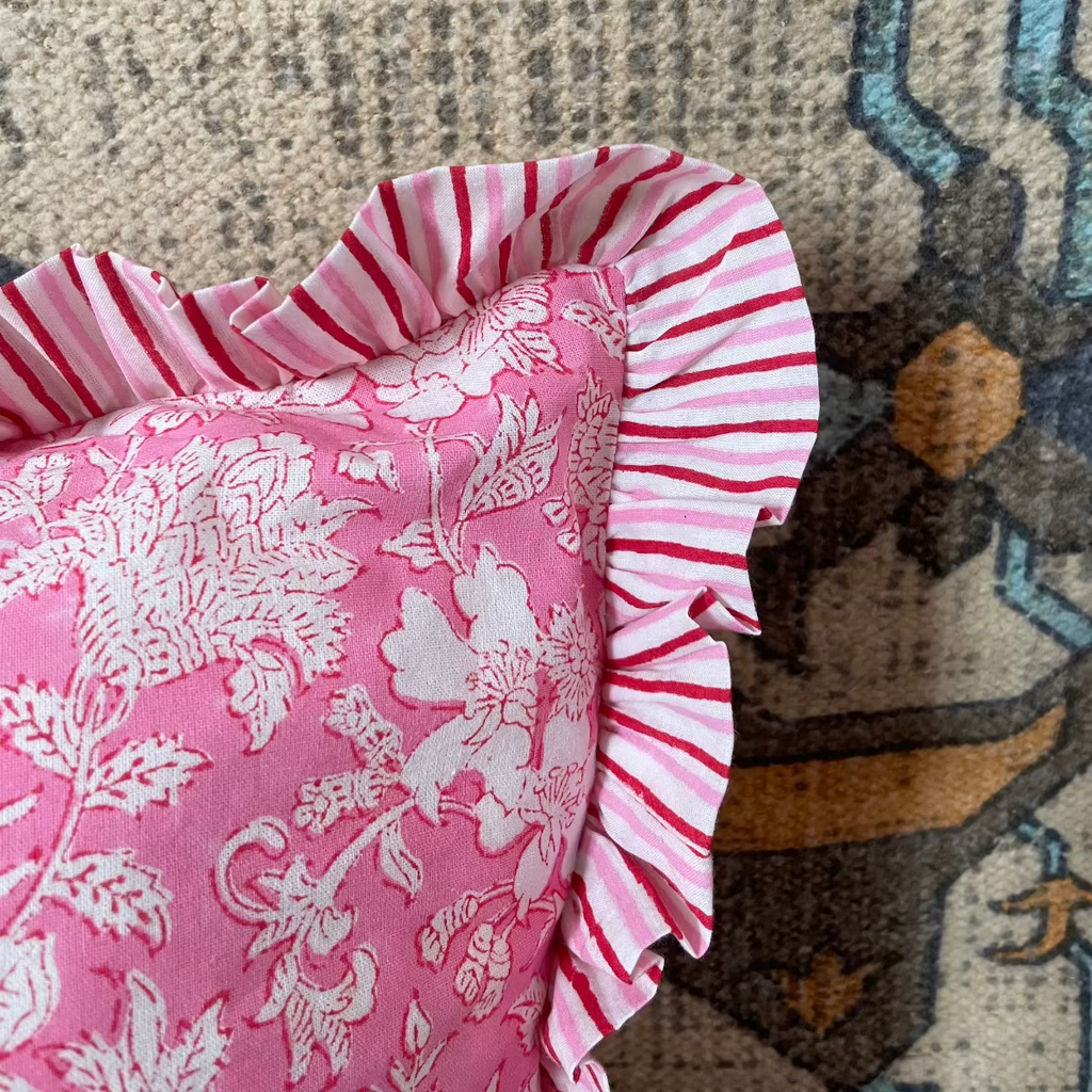 Hand Block Printed Cushion Cover - Pink Ruffle