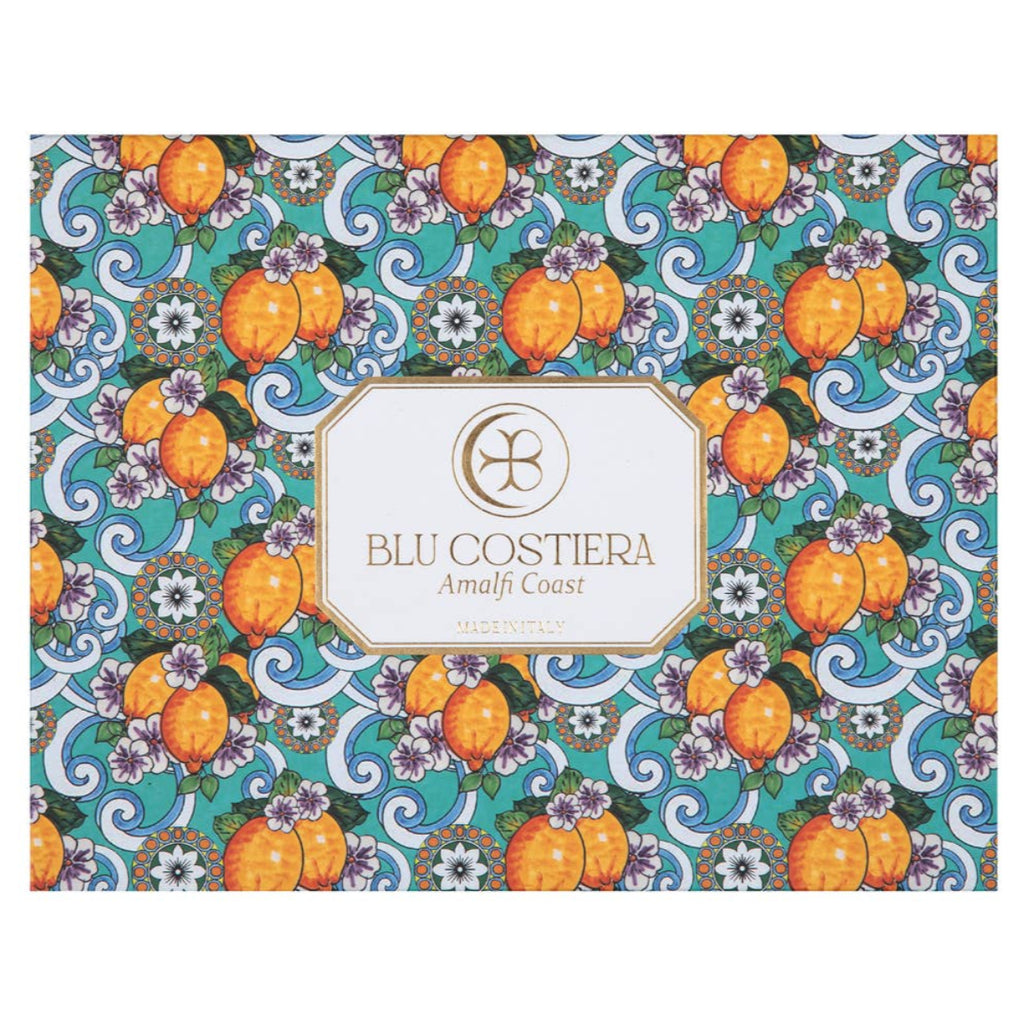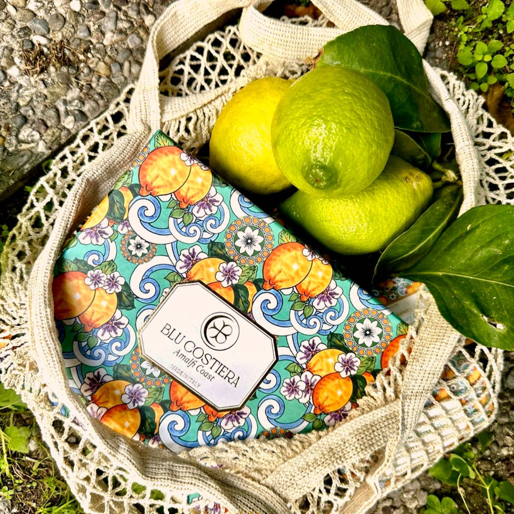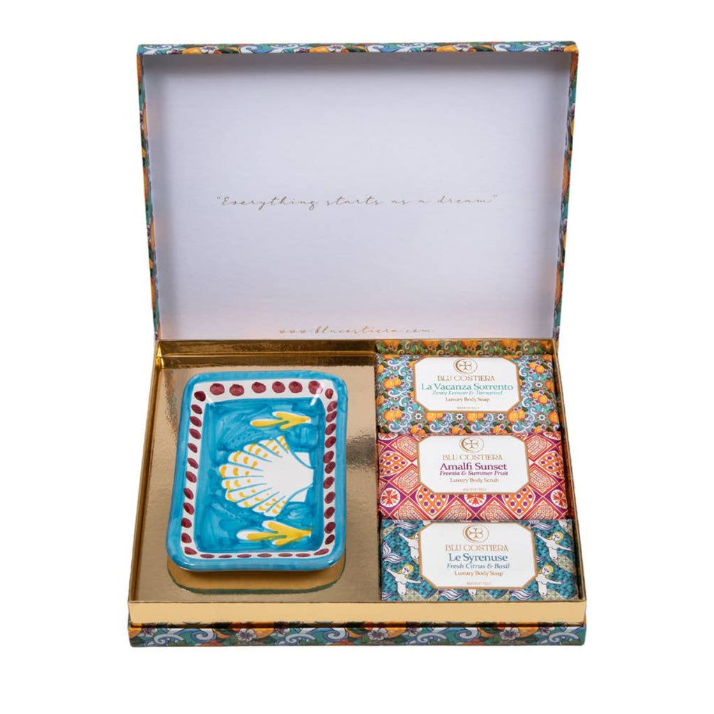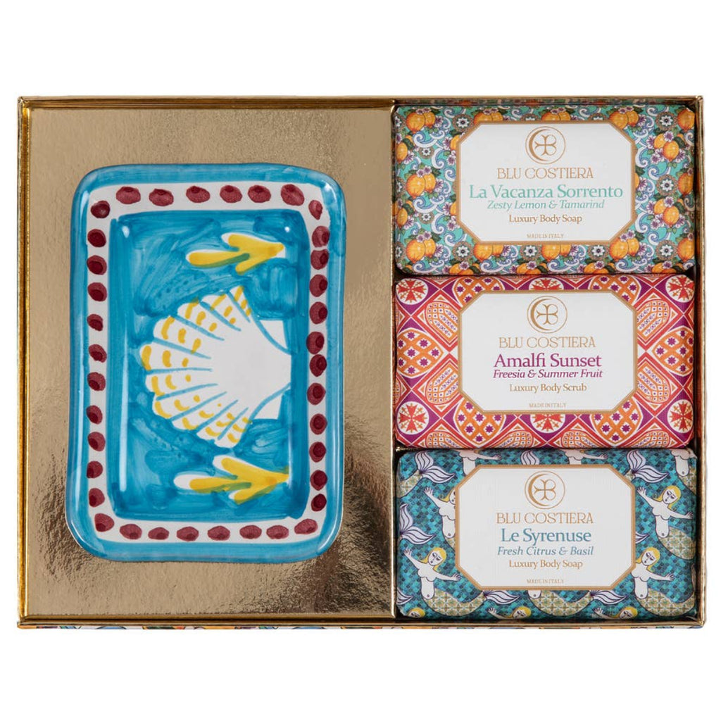 Made in Italy. Contains 3 solid soaps including a scrub and a handcrafted Vietri ceramic soap dish.