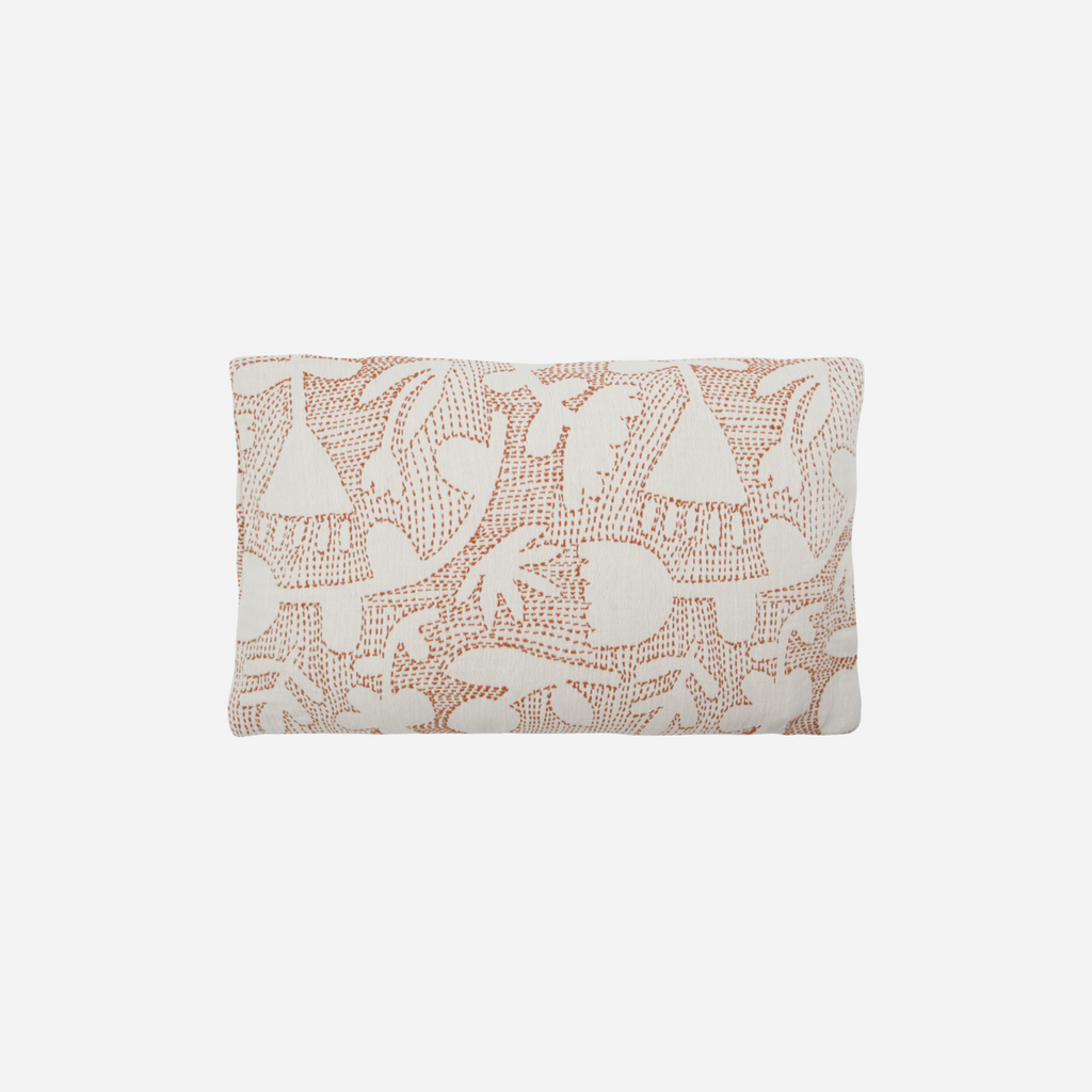 This handmade cushion cover is made from 100% cotton and features intricate stitching with soft, botanical motifs. Its richly textured surface adds a tactile, calming expression to sofas, armchairs, or beds.