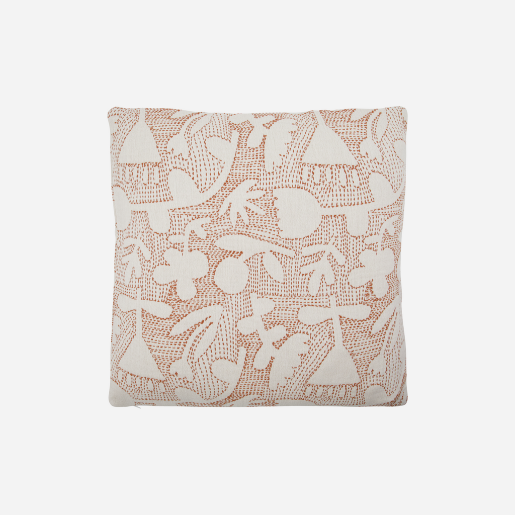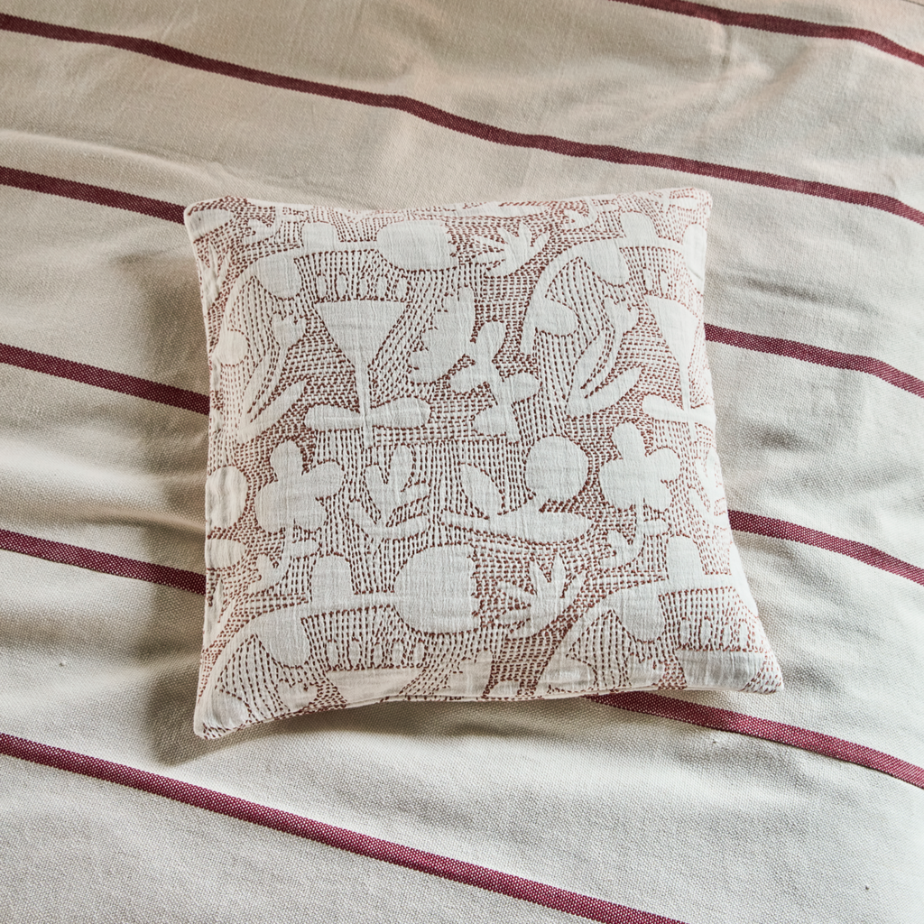 This handmade cushion cover is made from 100% cotton and features intricate stitching with soft, botanical motifs. Its richly textured surface adds a tactile, calming expression to sofas, armchairs, or beds.