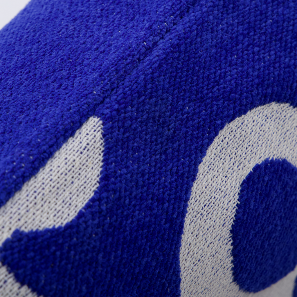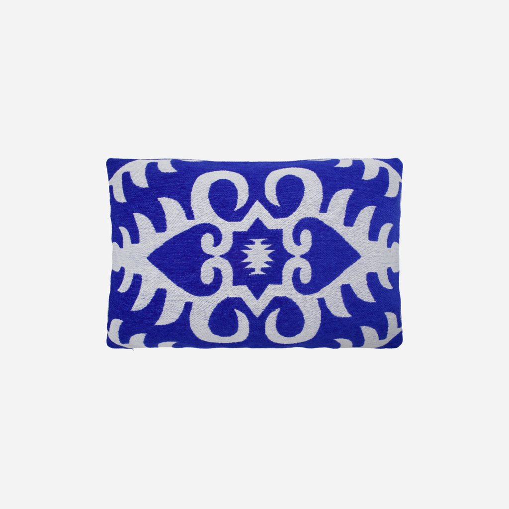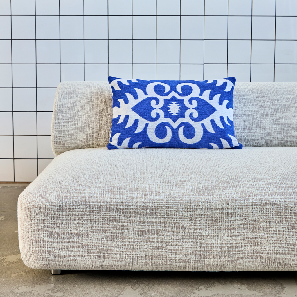 This pretty cotton cushion cover features an off-white pattern on a deep blue base. The woven texture adds a structured, durable quality to the soft fabric.
