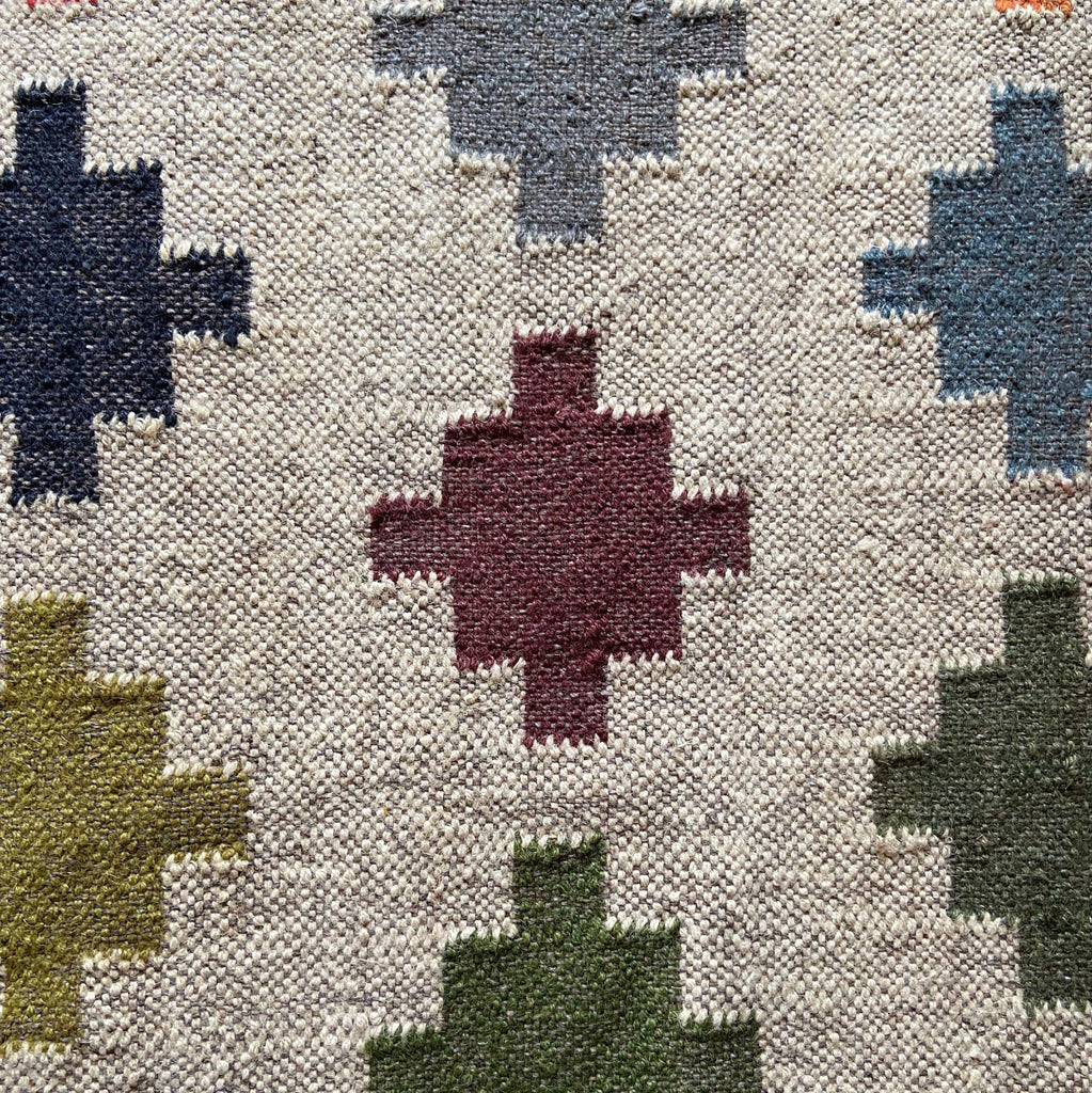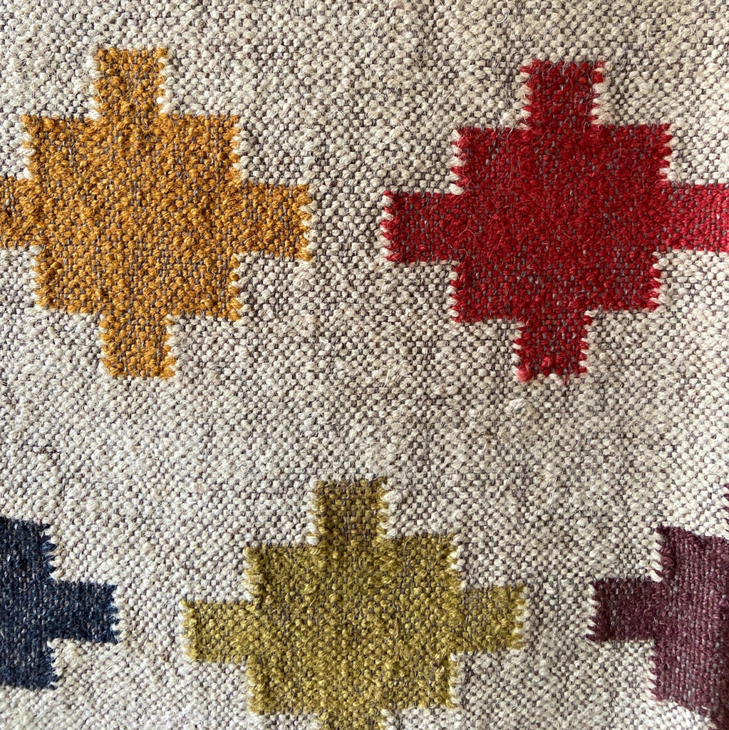 The rug is entirely made by hand — from dyeing to the final knot of the weaving — on a traditional loom in a small weaving studio in Rajasthan, India.