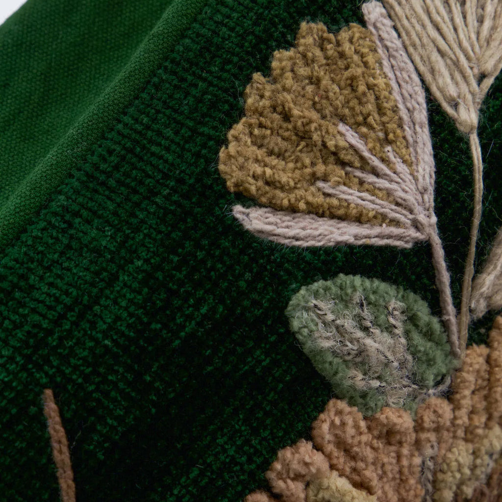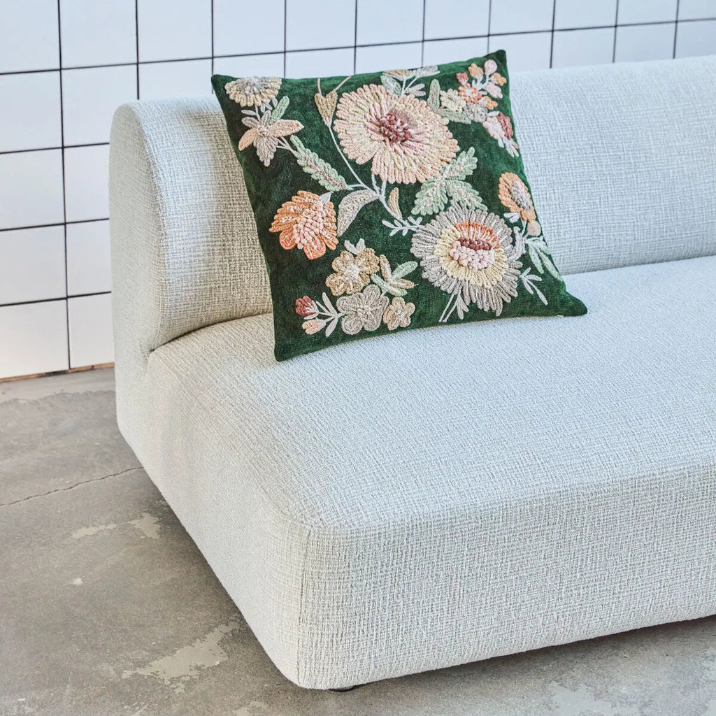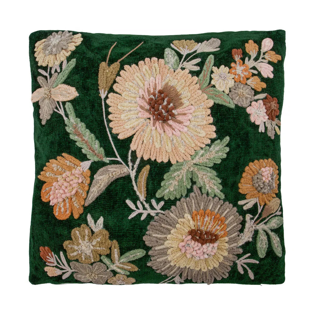 Beautiful deep green cushion cover with embroidered front in a mix of soft colours. The rich, three-dimensional texture and a detailed floral pattern adds interest and a feature to your sofa or bed.