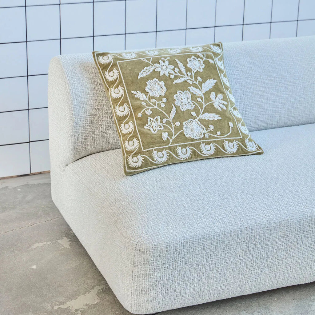 Beautiful handmade mustard cushion cover with embroidered front in a floral motif, off white chain stitch. The cushion cover front is made from soft velvet cotton and the pretty botanical pattern adds interest to your sofa or bed.