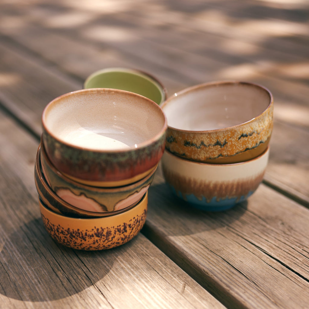 Gorgeous 70's ceramics by HKLiving noodle bowls. Glazed in a wonderful reactive glaze finish to give each piece its unique colour and pattern combinations. The perfect size for noodles, soups or serious pudding eaters.