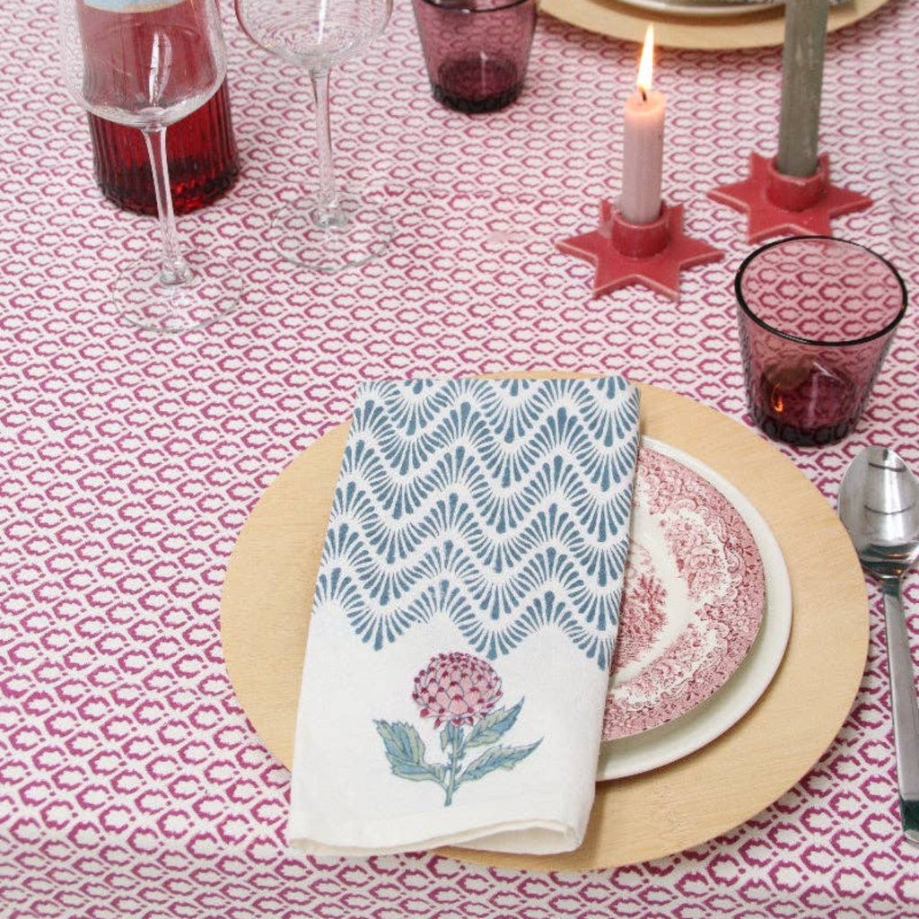 This fairmade, handprinted decorated napkin has a beautiful floral print and is made of high quality 100% cotton with a simple border. If you look closely you can see the blockprints. This tablecloth will add colour and individuality to your dining room or kitchen.