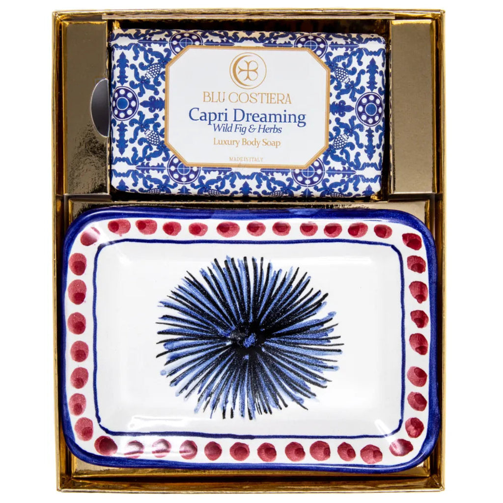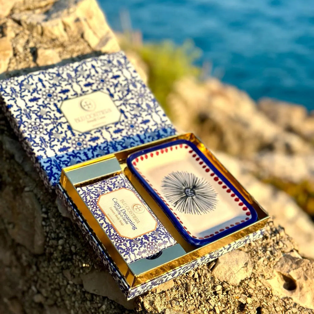 Gift set of a luxurious handmade Italian plant based soap, vegan, cruelty free and cold pressed. Inspired by the scents and colours of the Amalfi coast, with hand painted ceramic soap dish.
