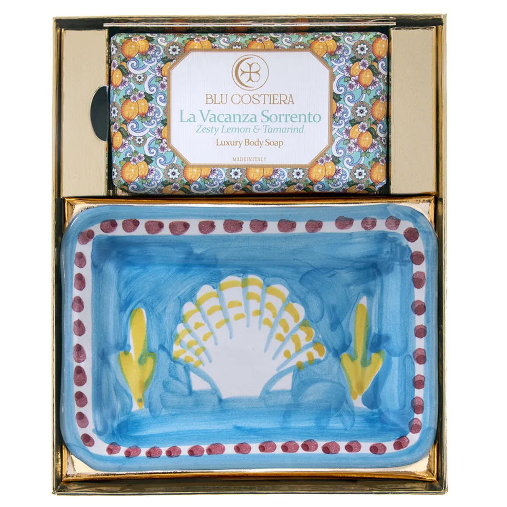 Gift set of a luxurious handmade Italian plant based soap, vegan, cruelty free and cold pressed. Inspired by the scents and colours of the Amalfi coast, with hand painted ceramic soap dish.