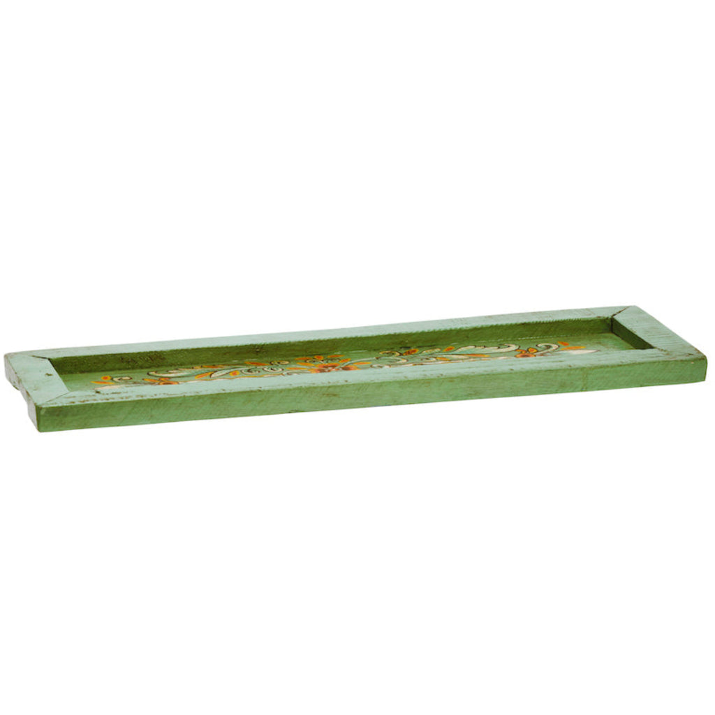 This hand-painted tray is crafted in Jodhpur, India, known for its unique furniture craftsmanship using recycled wood. In aqua, off white, orange, black; this piece is beautifully hand painted in a floral and leaf design. The wood, repurposed from old buildings, brings a touch of history with its natural cracks and irregularities, enhancing its charm. Ideal for use as a serving tray, wall decoration, or as a display for small plants and candles, each tray is unique due to its handmade nature and recycled materials.