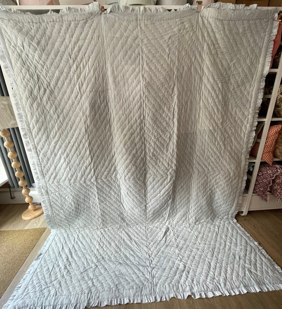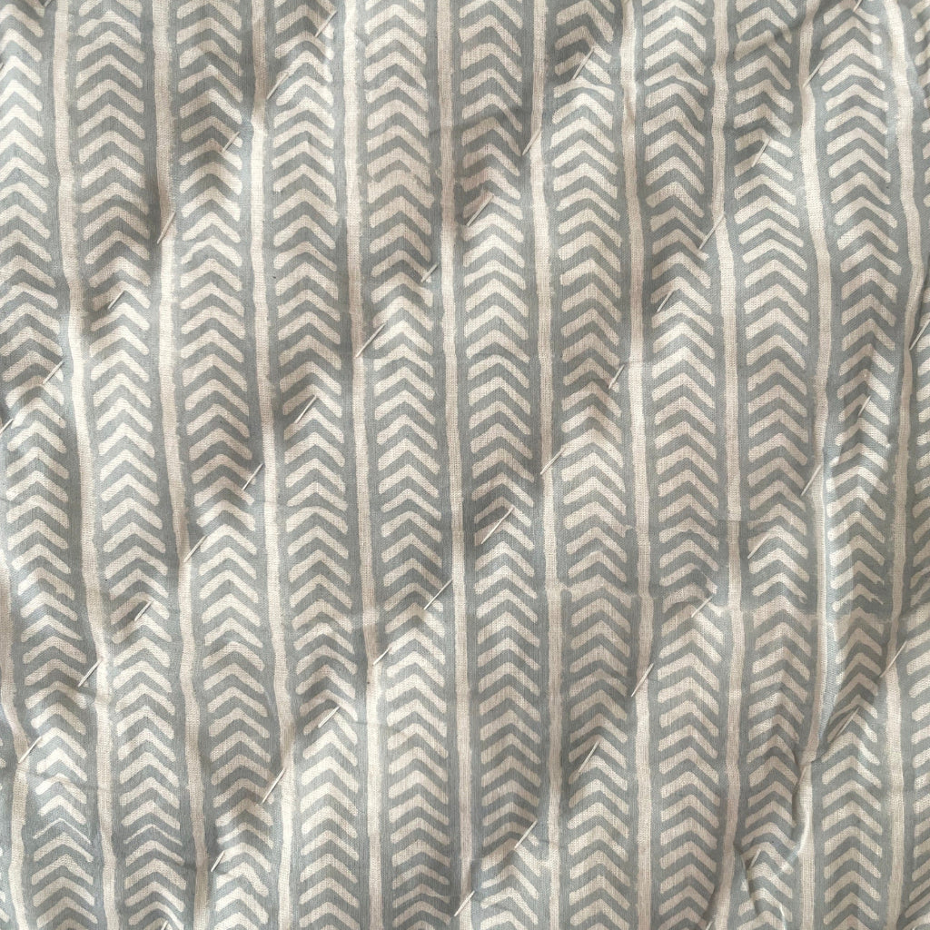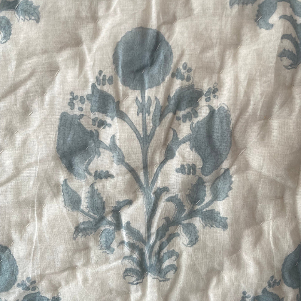 Product Details: 100% Cotton Voile outer and Cotton wadding filling. Hand stitched, hand block printed quilt.
