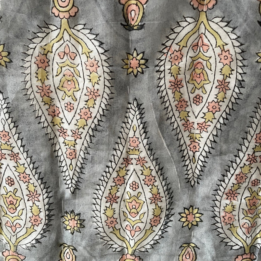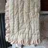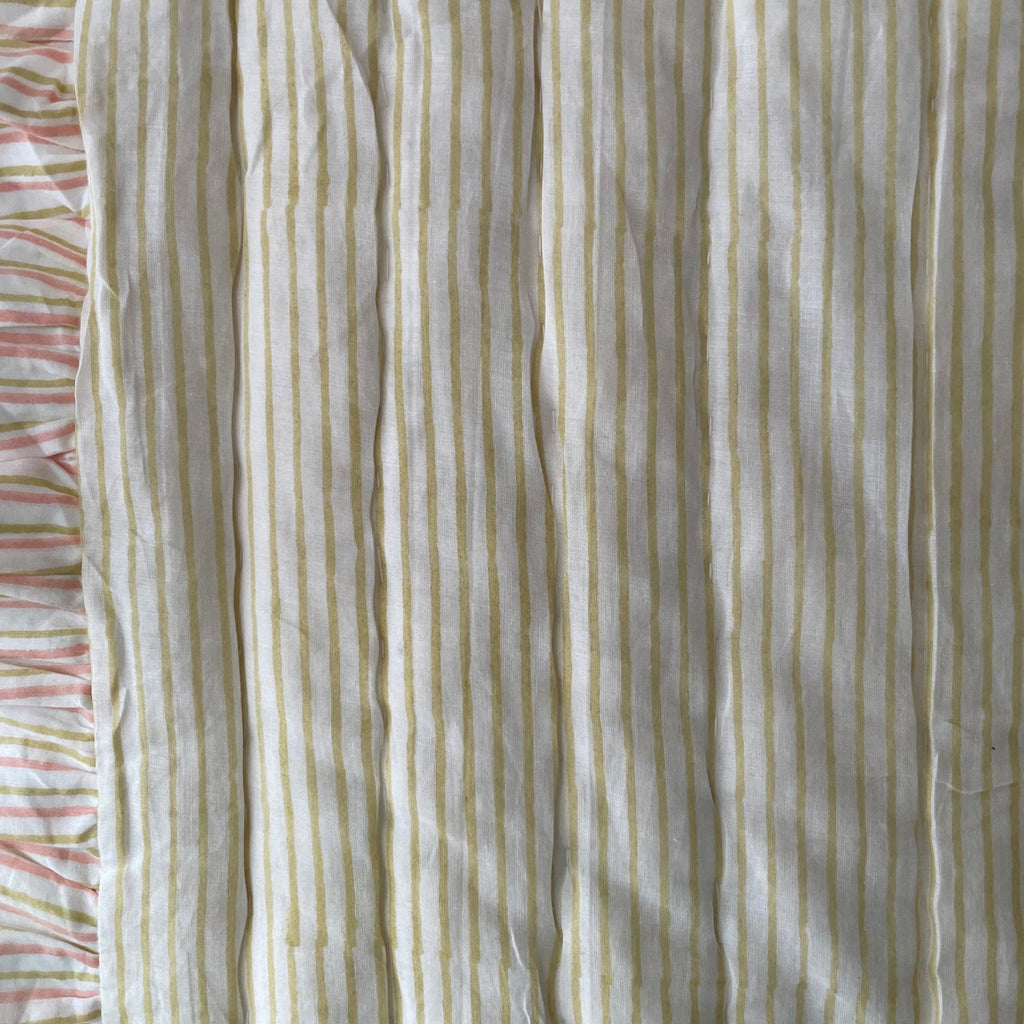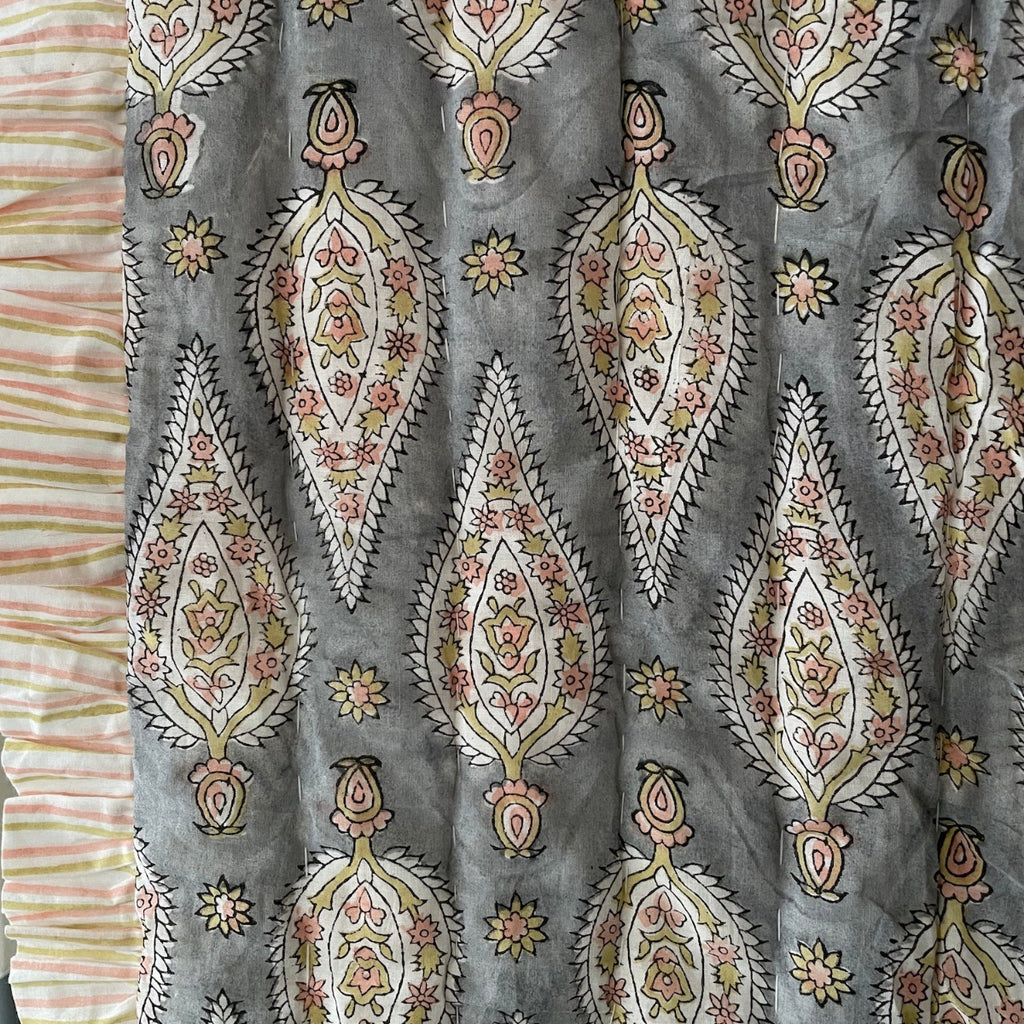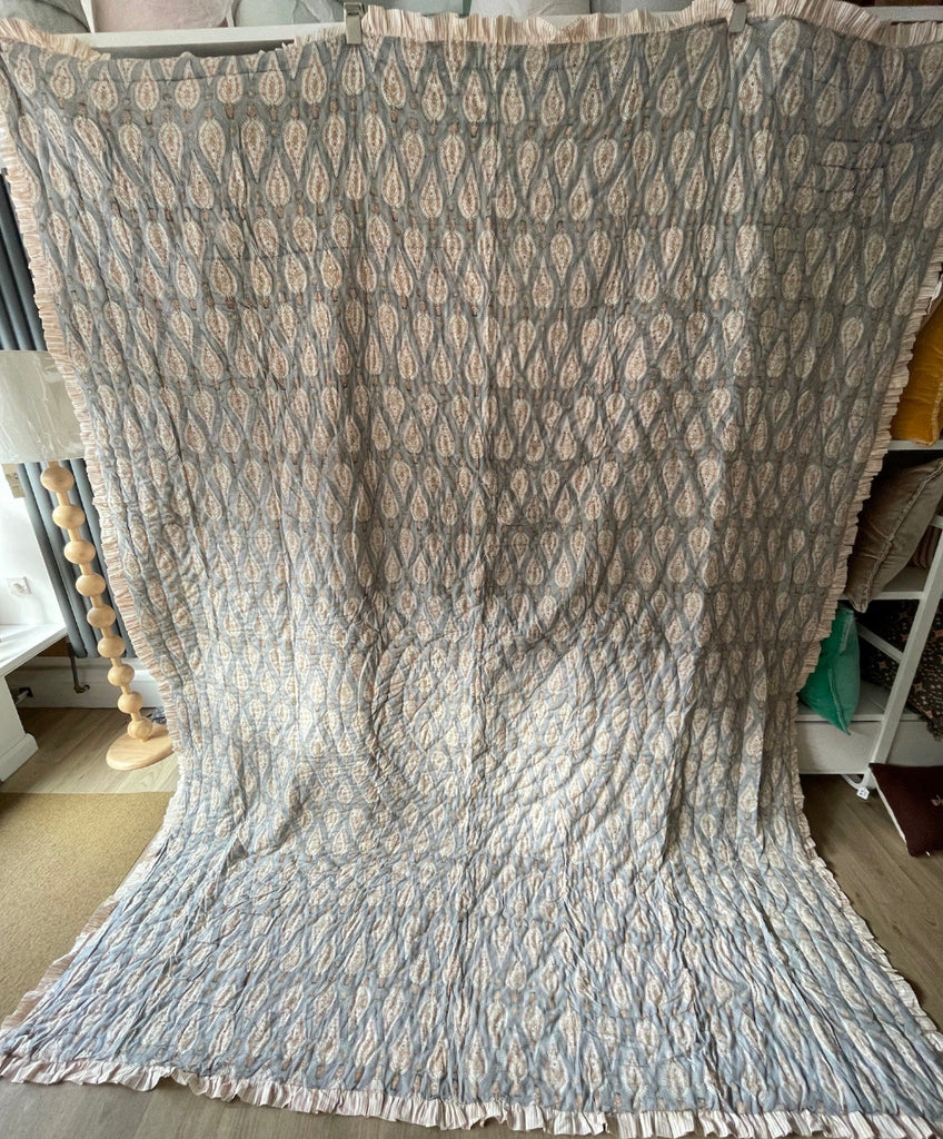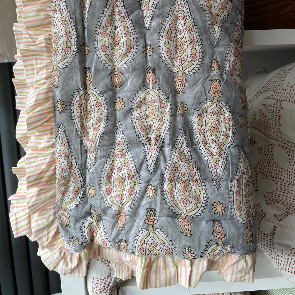 / Reversible Block Print Cotton Quilt - Grey/Coral/Green Leaf/Stripe Ruffle