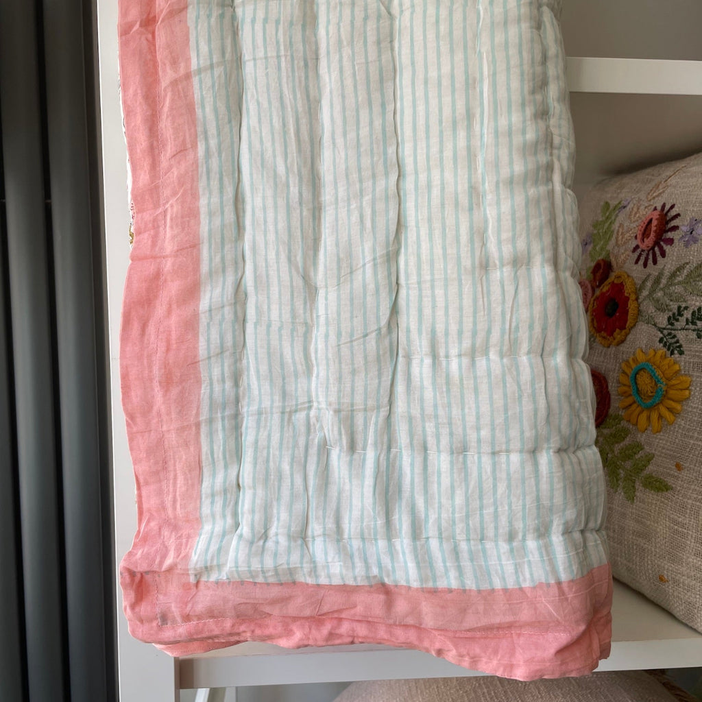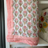 Reversible Block Print Cotton Quilt - Pink Flower/Blue Stripe