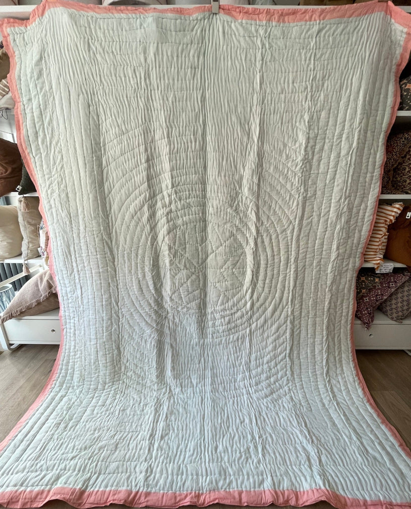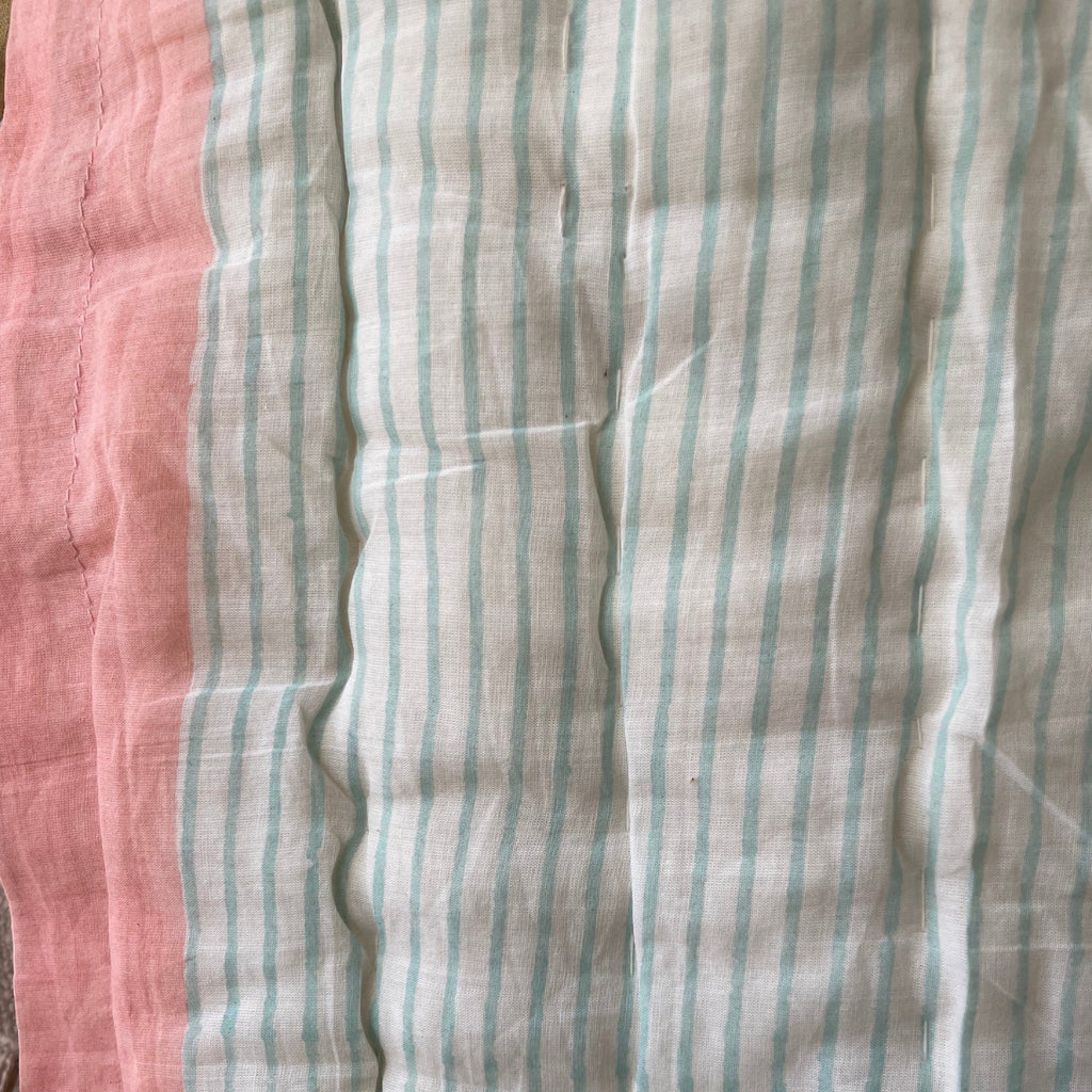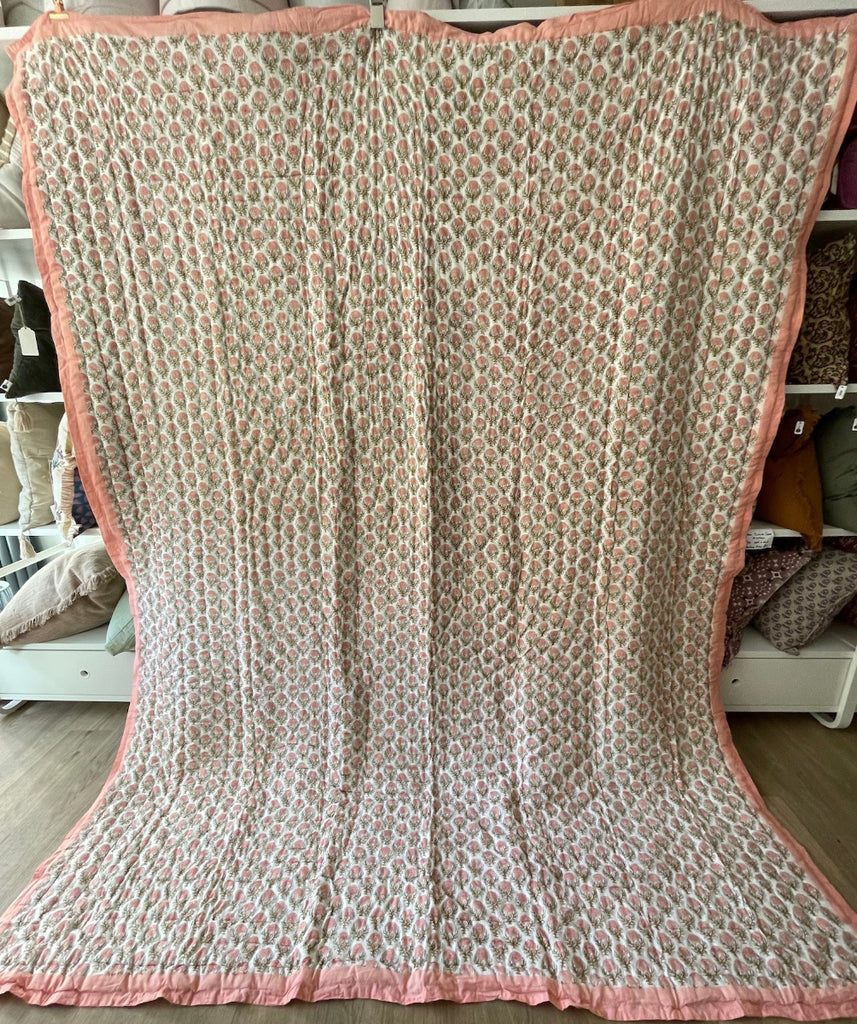 Product Details: 100% Cotton Voile outer and Cotton wadding filling. Hand stitched, hand block printed quilt.