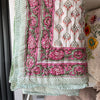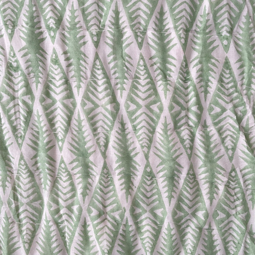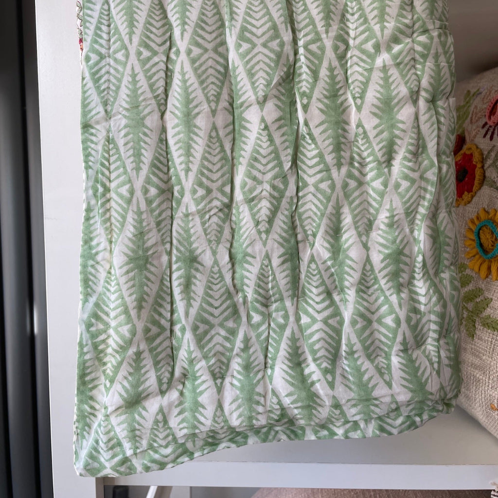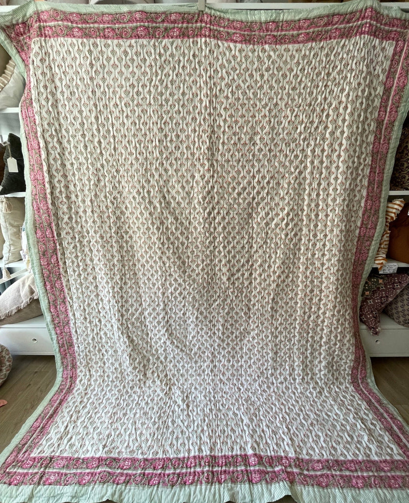 Product Details: 100% Cotton Voile outer and Cotton wadding filling. Hand stitched, hand block printed quilt.