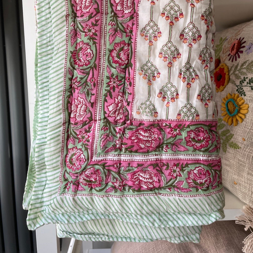 Beautiful super soft reversible quilts, hand made in India using traditional wooden blocks to print the designs. Each piece is slightly different to the next due to them being hand printed, making these really lovely individual pieces.