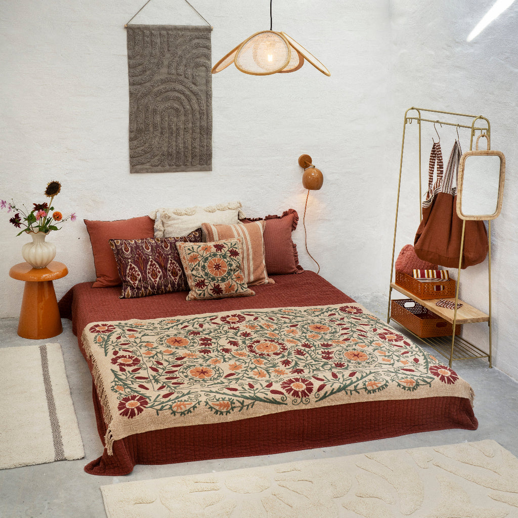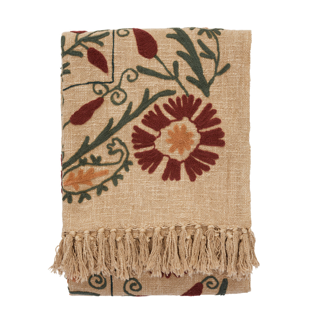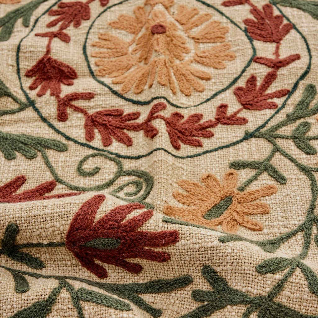 Madam Stoltz Embroidered Suzani Cotton Throw - Sand, ruby wine