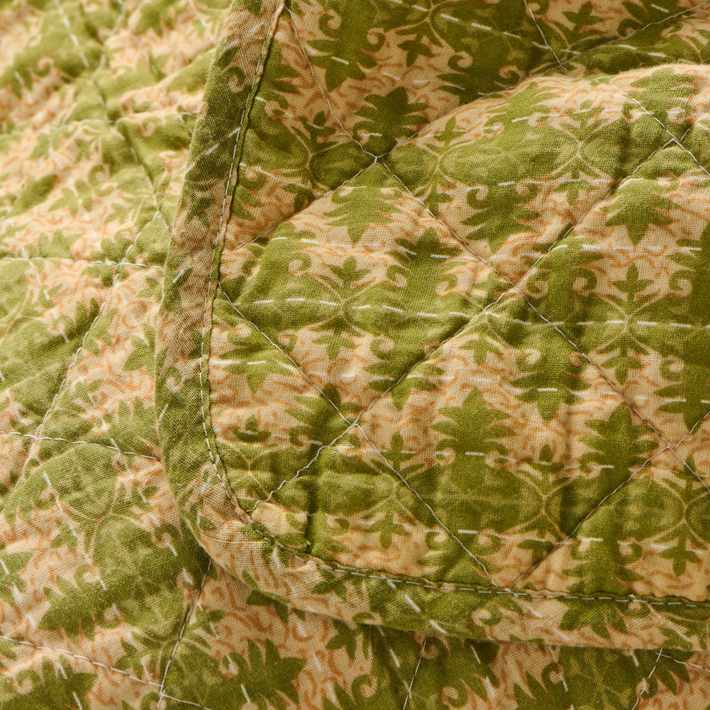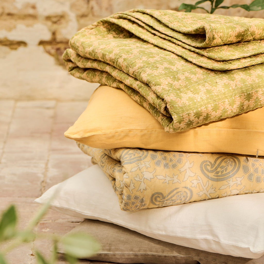 Filled with soft cotton wadding and lightly quilted, these are warm in winter and being natural fabric; cool and breathable in summer. Adds softness and interest to your decor. Use as a bed quilt or throw on a sofa.