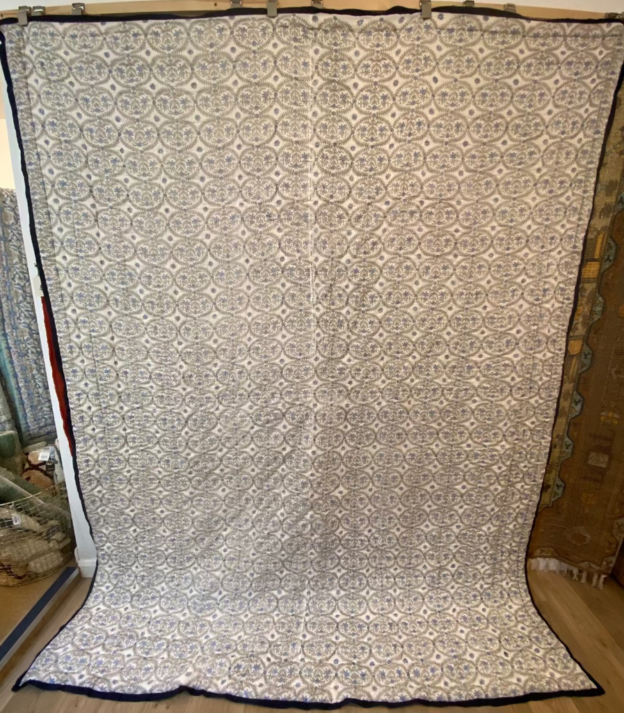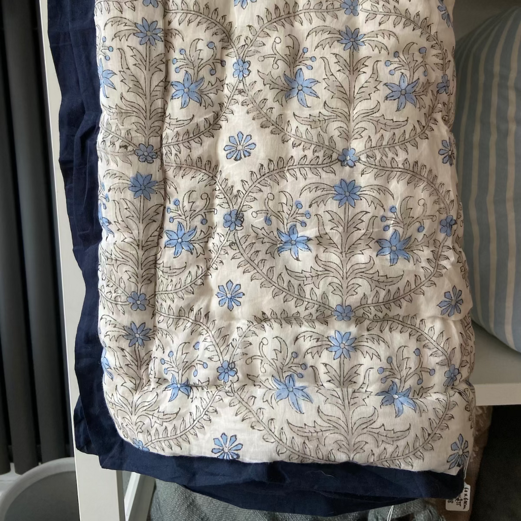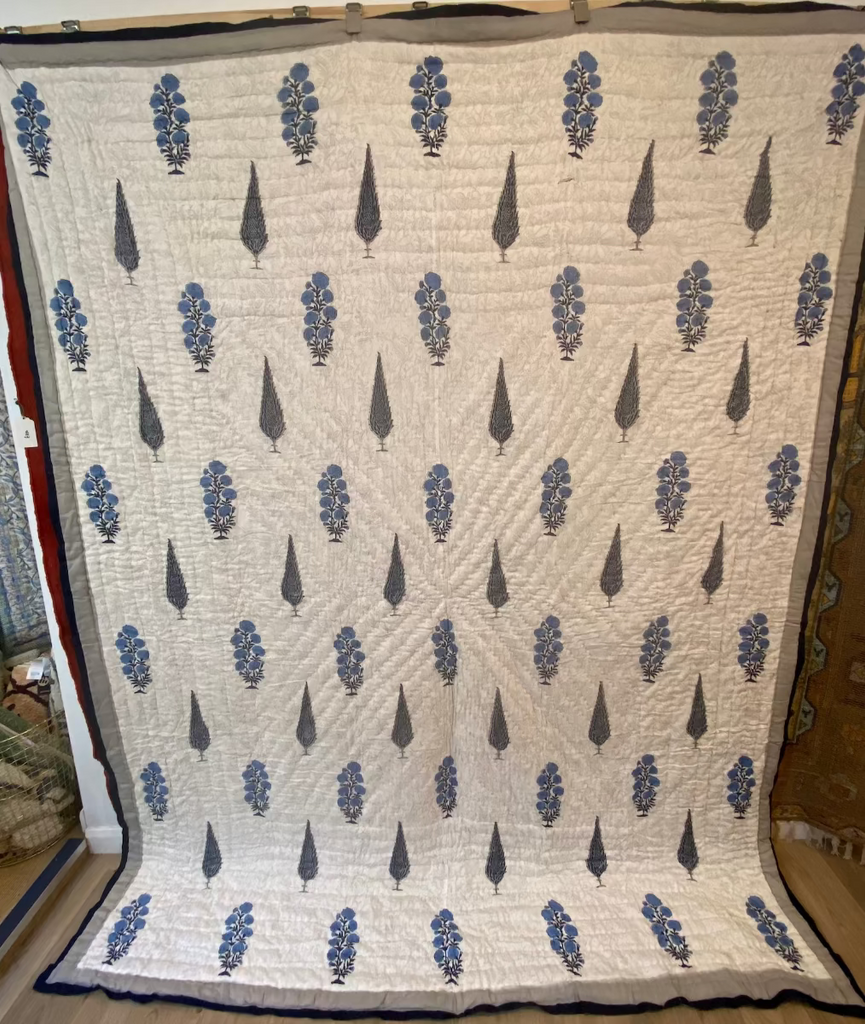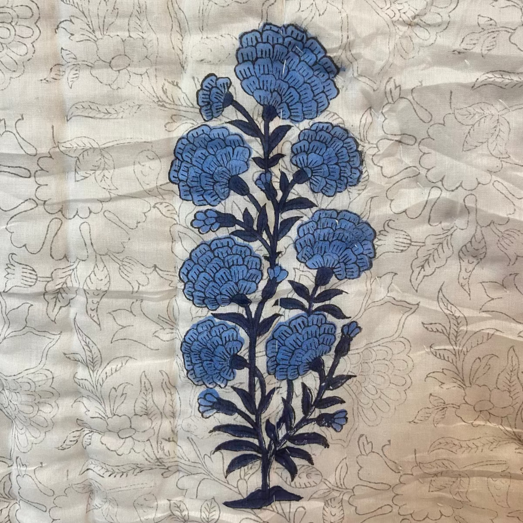 / Reversible Block Print Cotton Quilt - Blue and Grey Tree/Flower