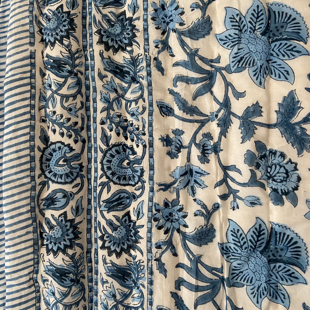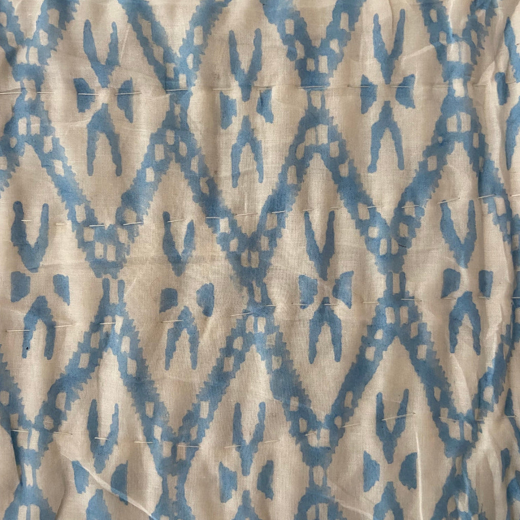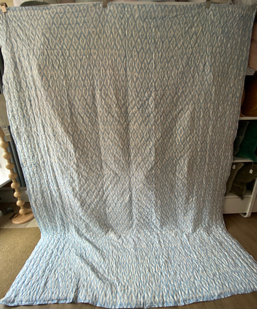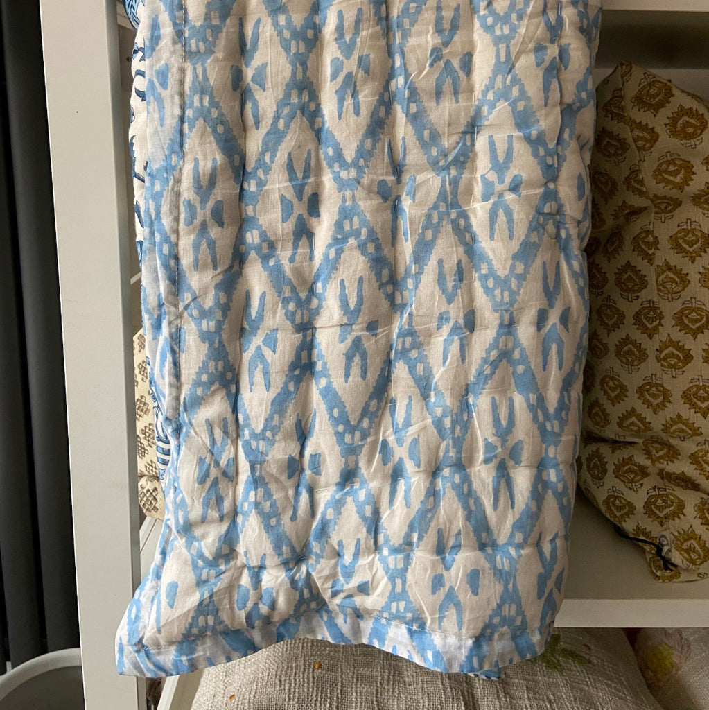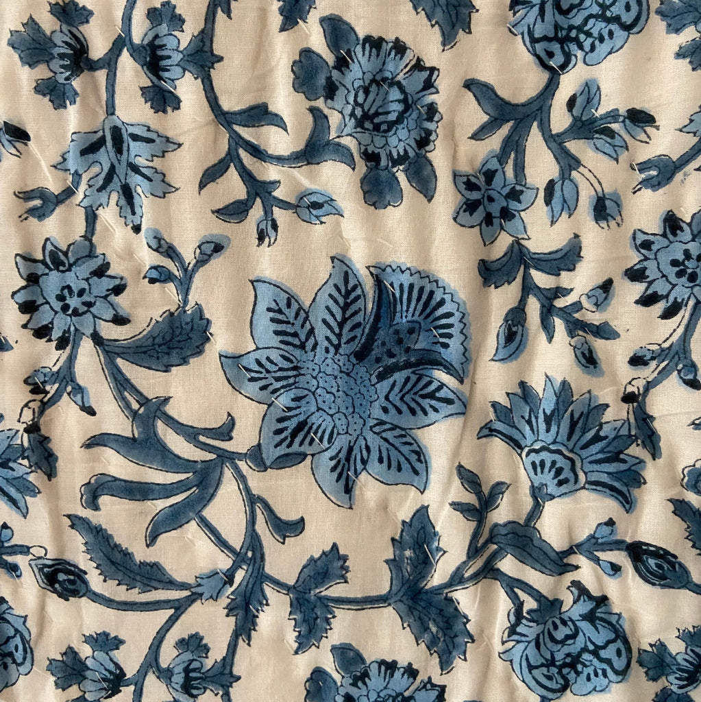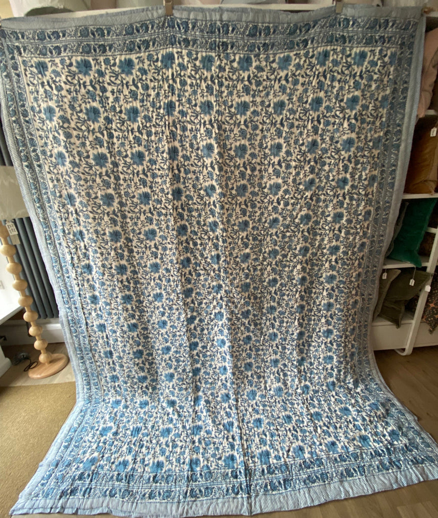 Product Details: 100% Cotton Voile outer and Cotton wadding filling. Hand stitched, hand block printed quilt.