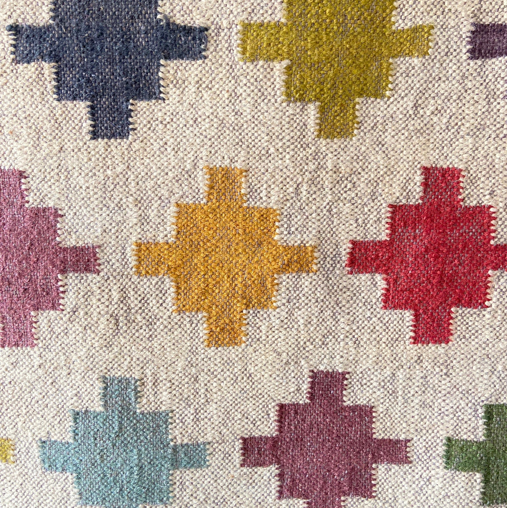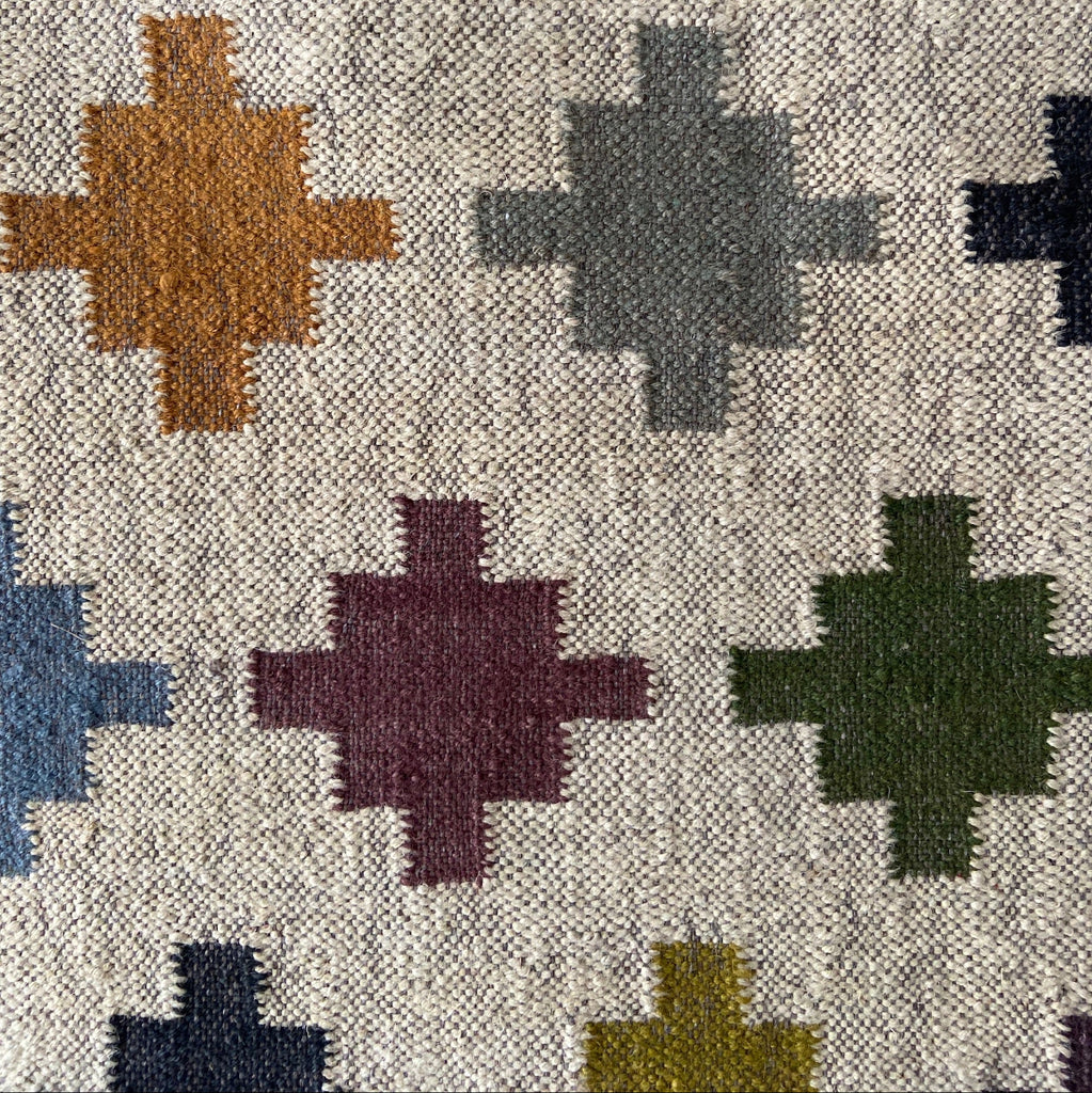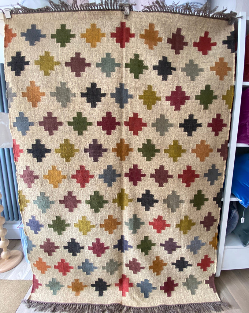 The rug is entirely made by hand — from dyeing to the final knot of the weaving — on a traditional loom in a small weaving studio in Rajasthan, India.