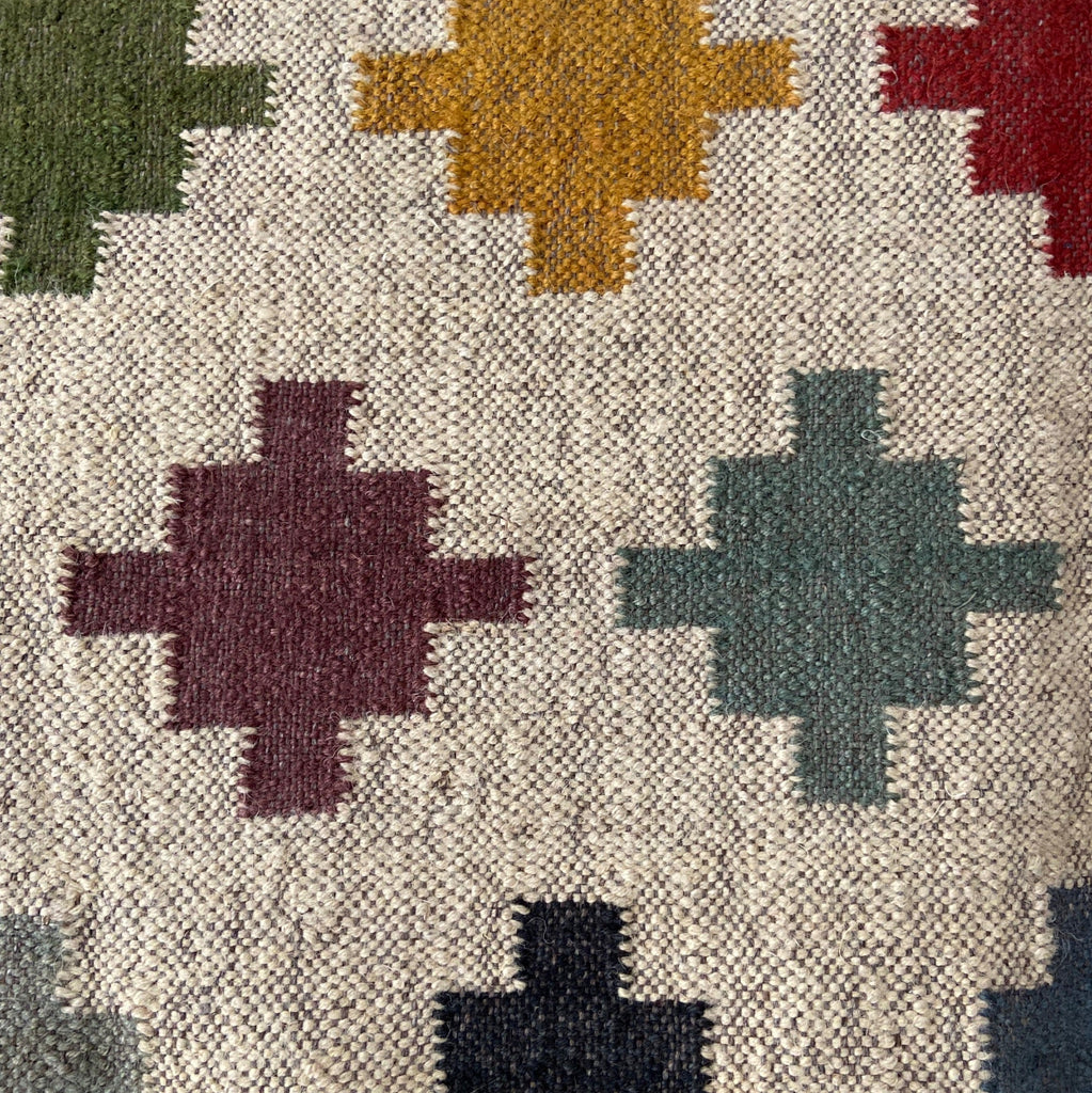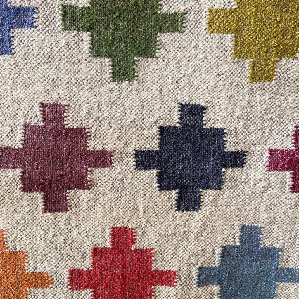 Gorgeous, flat weave Kilim, handmade from Jute and Wool. Kilims are famous for their rich colours, warm tones, and beautiful ethnic motifs traditional in many cultures, ranging from Greek, Armenian, Kurdish, Assyrian, & Turkish.