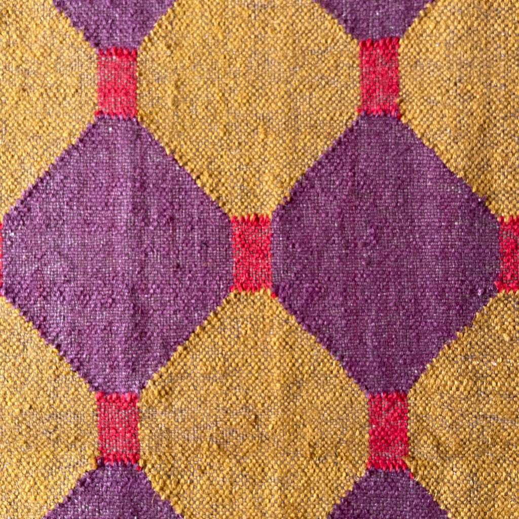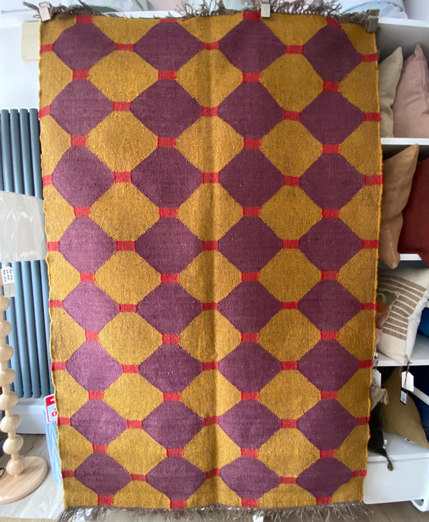 The rug is entirely made by hand — from dyeing to the final knot of the weaving — on a traditional loom in a small weaving studio in Rajasthan, India.
