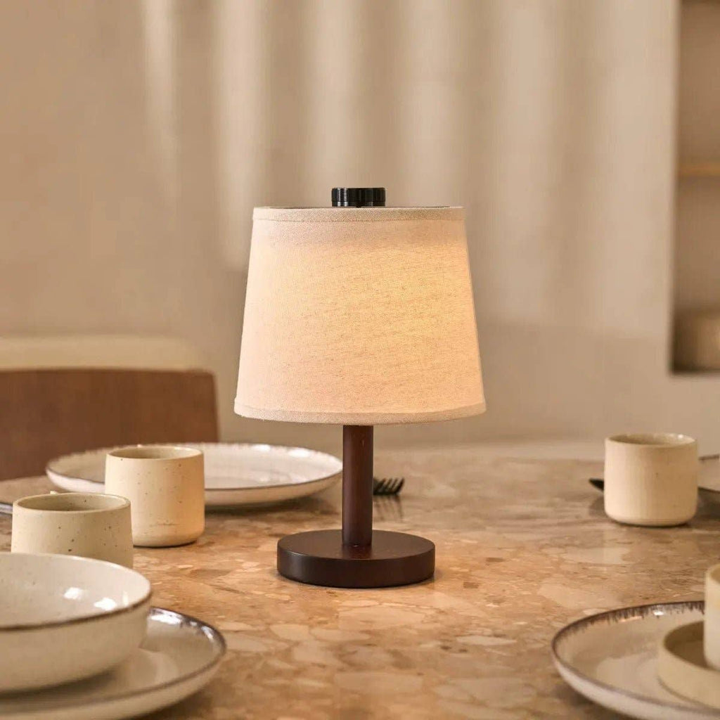 Elegant cordless dark wood table lamp with a linen shade, perfect for lighting corners with no plugs, extra table lighting during dinners, night reading lamps. USB charged making them fully portable and versatile.
