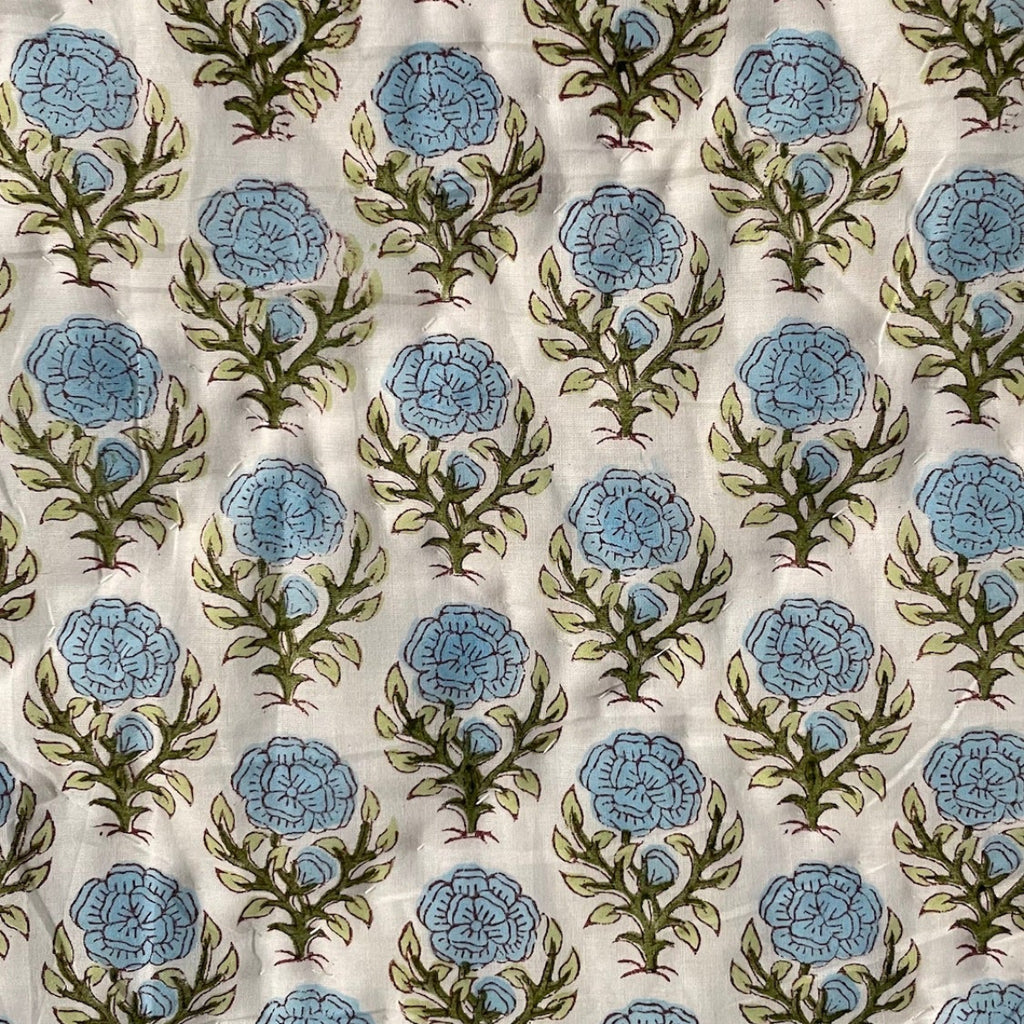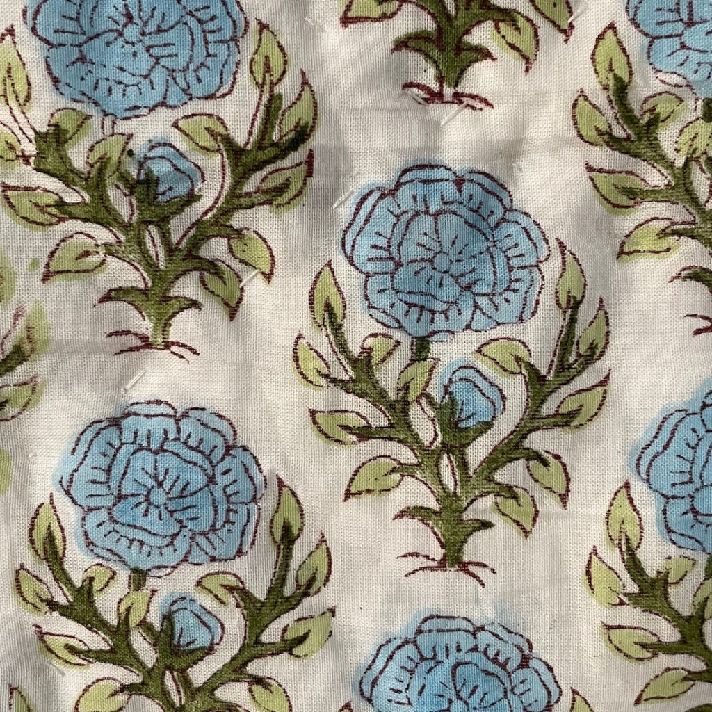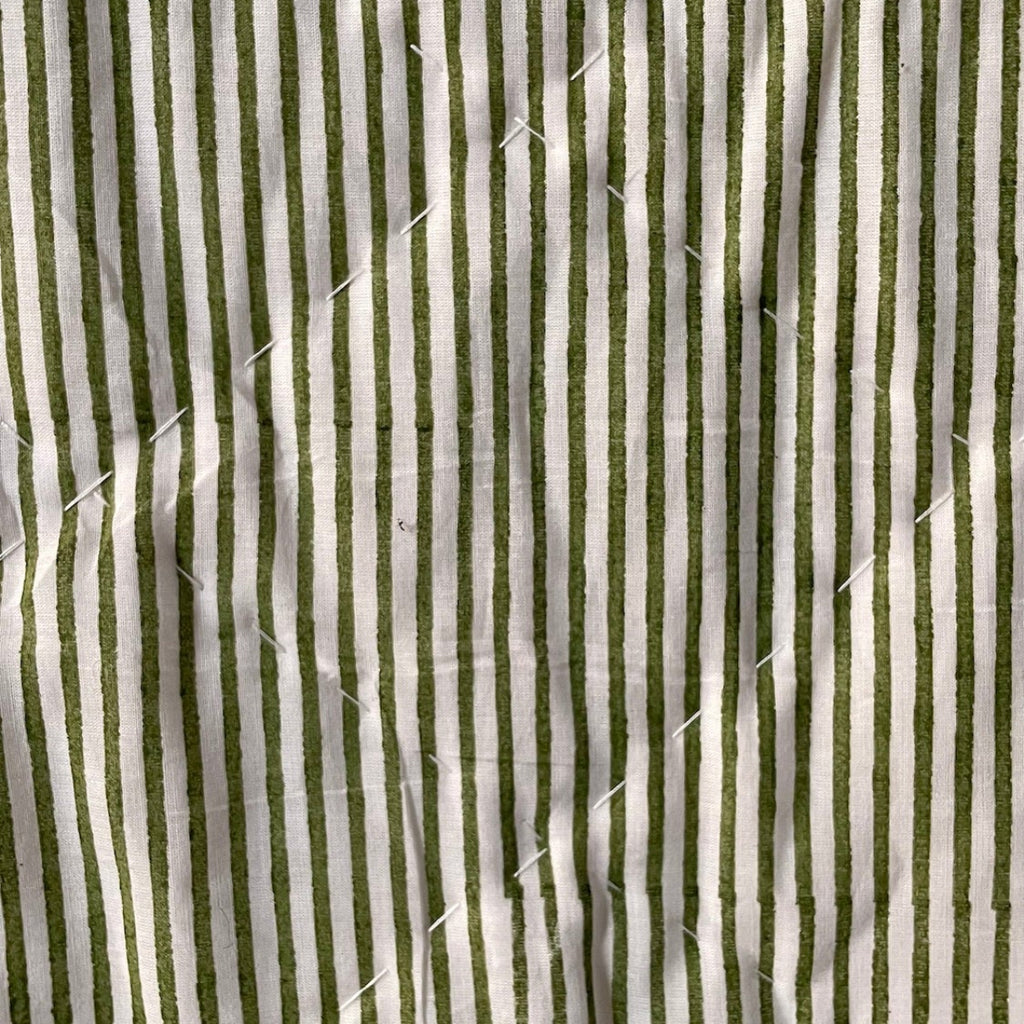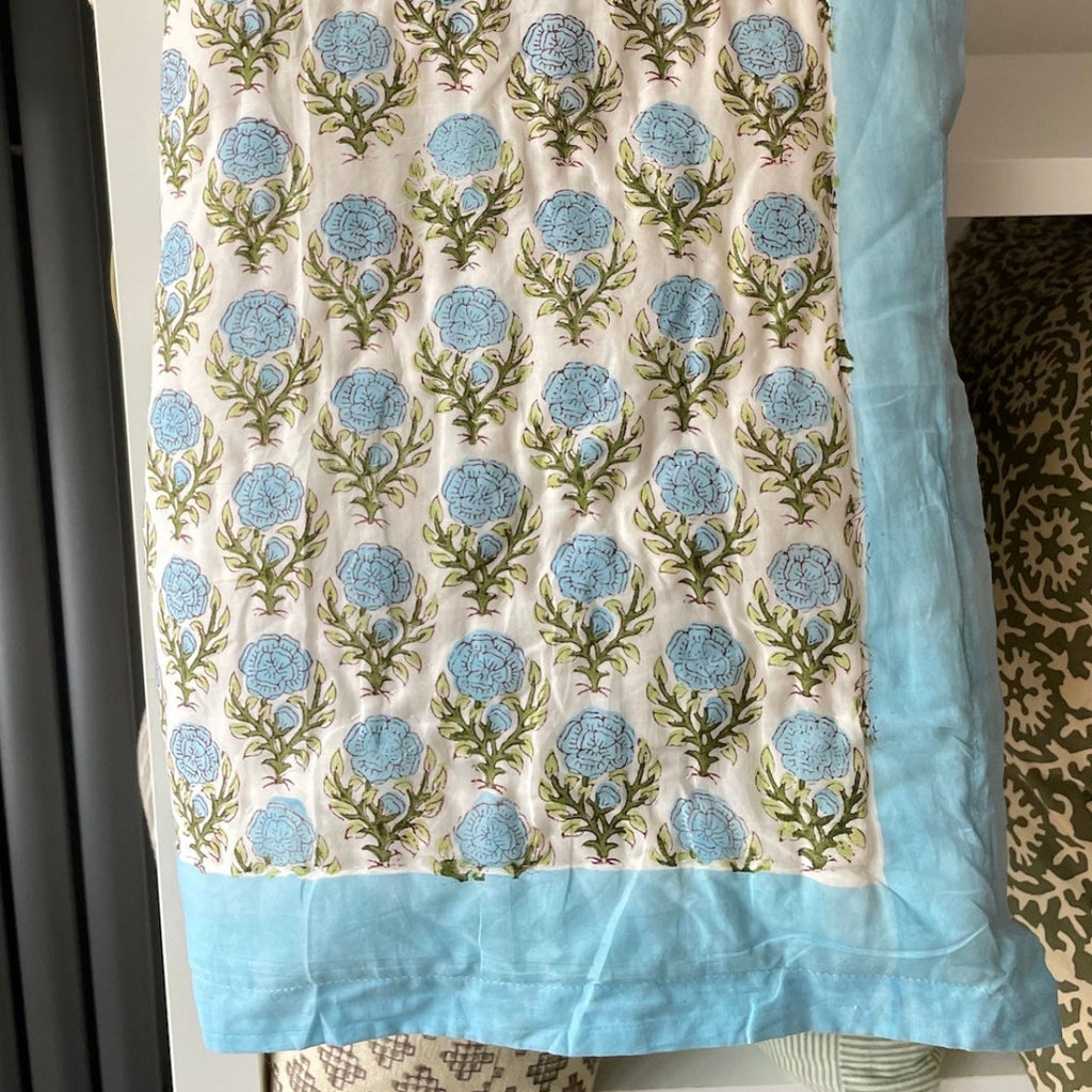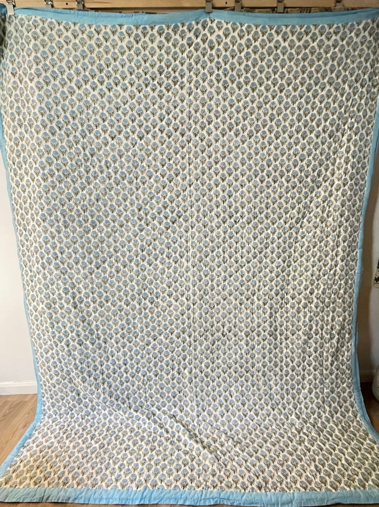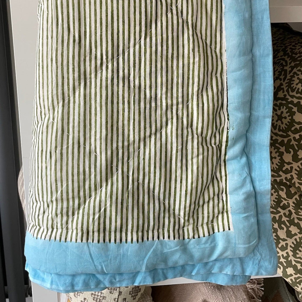 / Reversible Block Print Cotton Quilt - Blue Marigold/Green Stripe