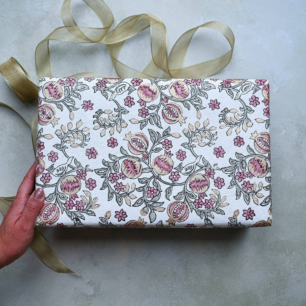 A beautiful range of premium gift wrap, hand block printed on ivory cotton paper using 2 or more colours. A separate wooden block is used for each colour application. Symmetry forms the core of the design and pattern repeats must be perfectly balanced.