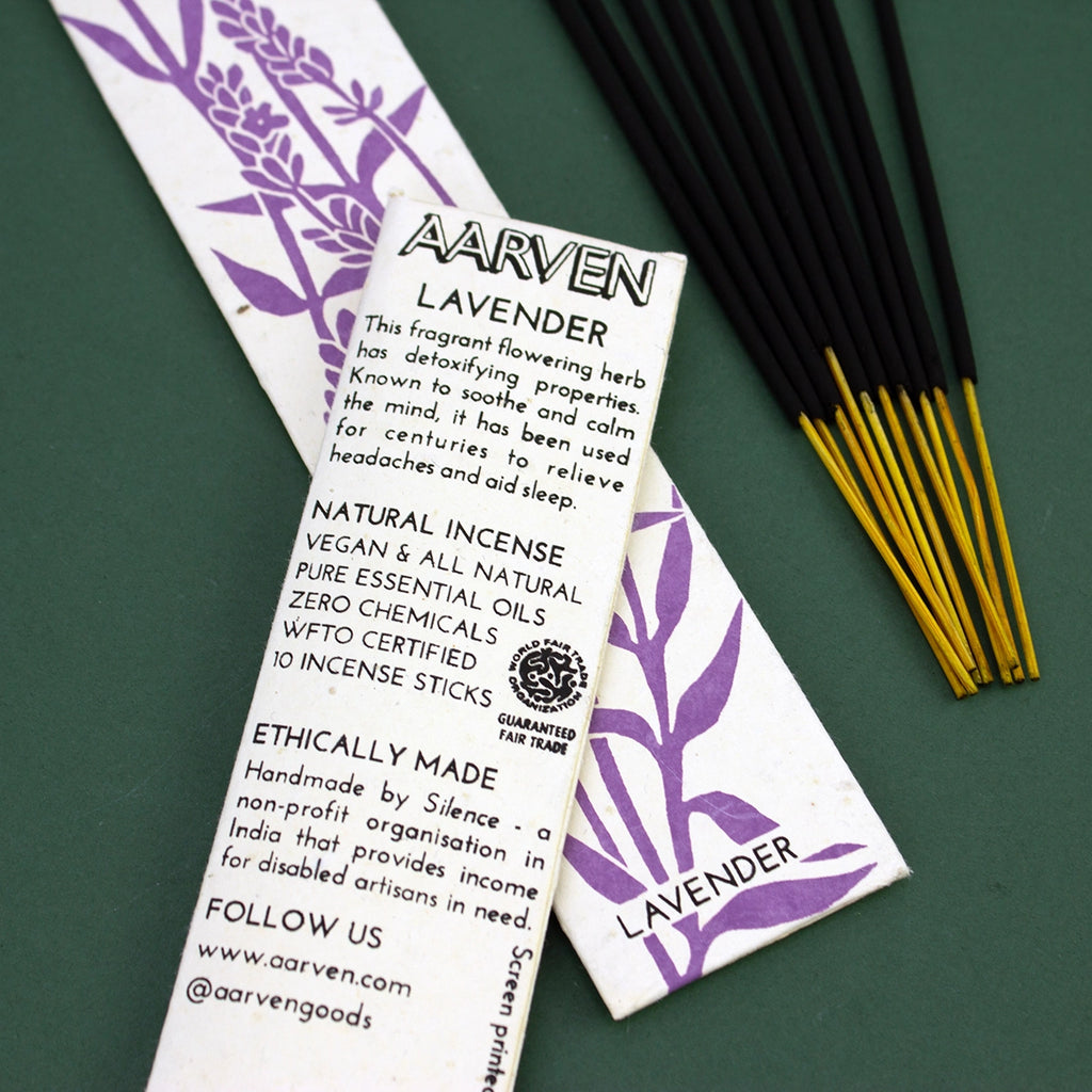 Handmade incense sticks by Silence – a World Fair Trade certified organisation in Kolkata, India who provide reliable income for physically challenged artisan employees. Many of the artisans are deaf, voiceless, blind, handicapped, or mentally ill. The focus of the charity is to offer opportunities to those in need.