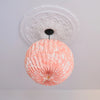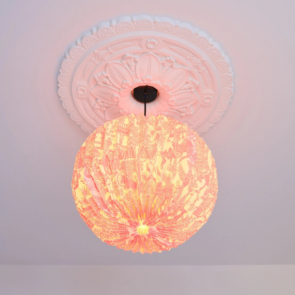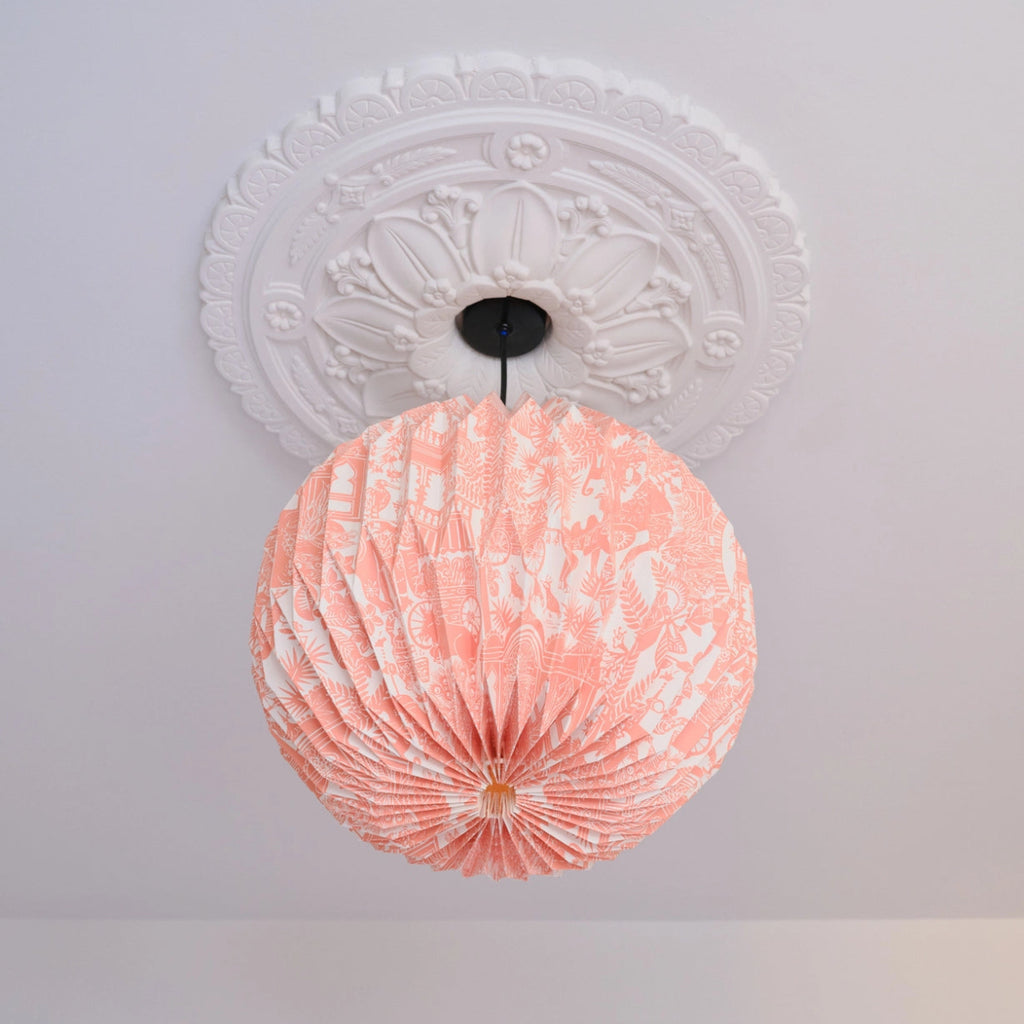 Gorgeous hand made paper origami globe pendant lamp shade in an orange and white toile pattern. The paper has been screen printed by skilled artisans in Jaipur using traditional methods onto FSC certified paper, making them both beautiful and sustainable.