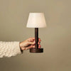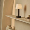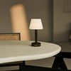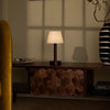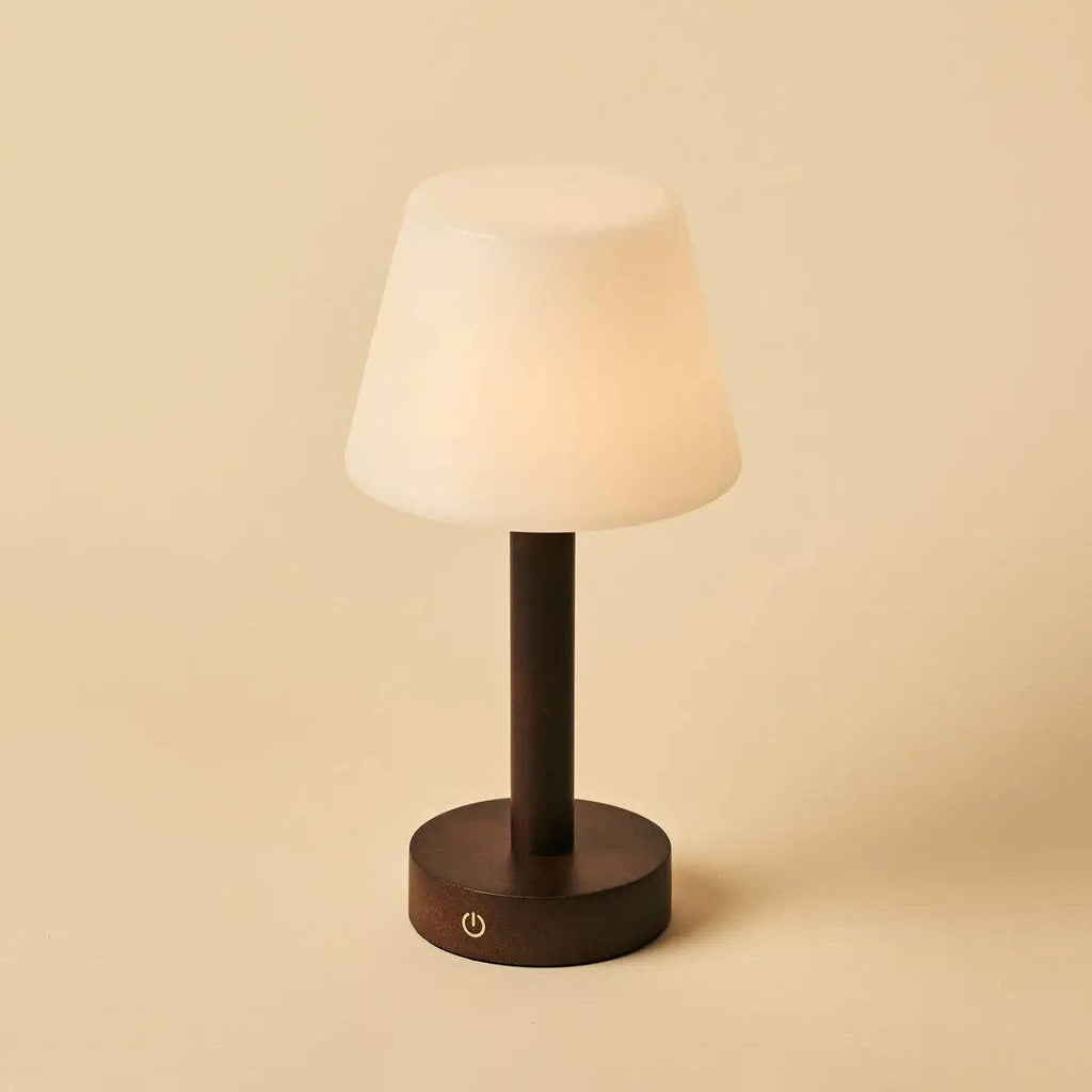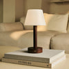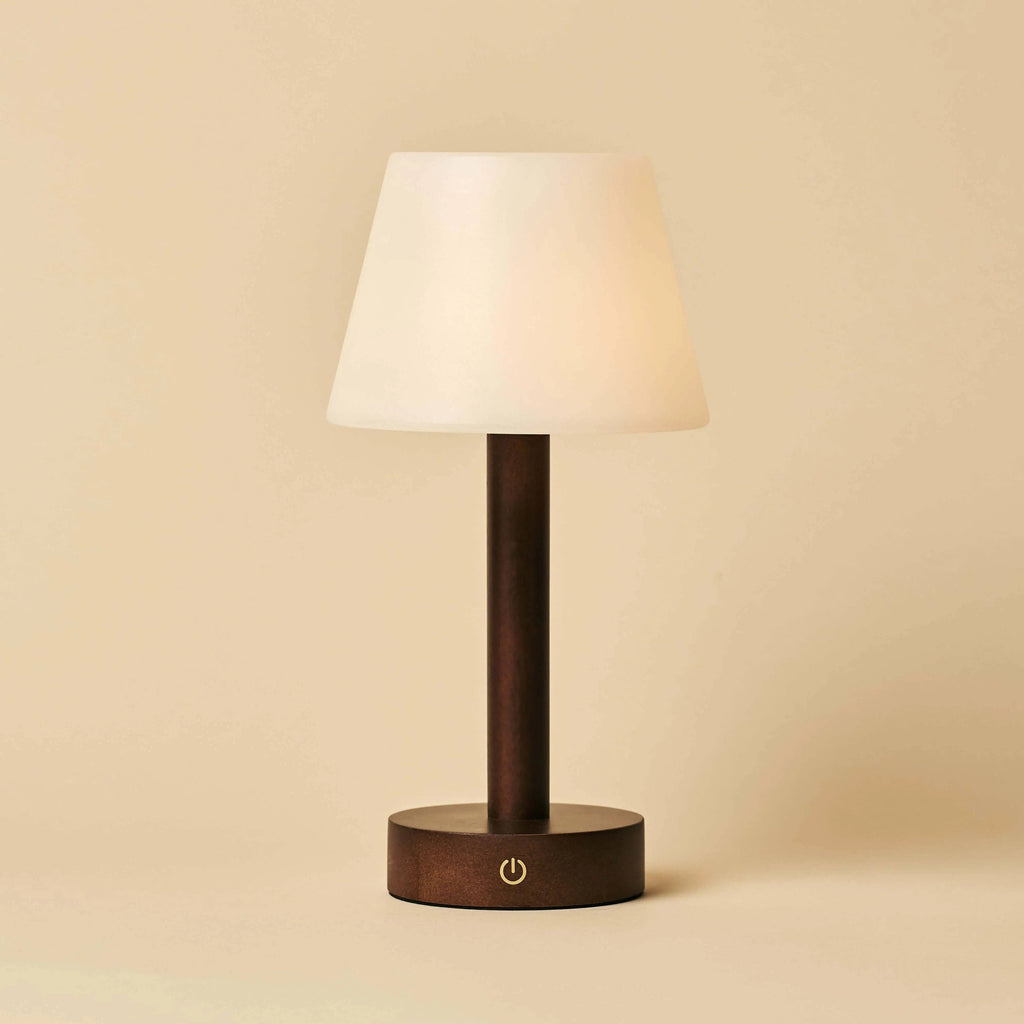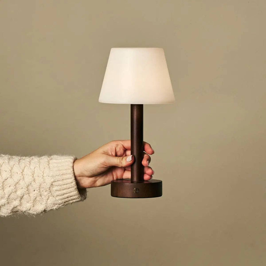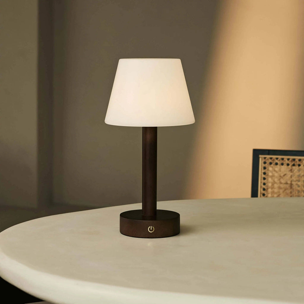 Elegant cordless rubber wood table lamp in a dark wood colour with frosted shade, perfect for lighting corners with no plugs, extra table lighting during dinners, night reading lamps. USB charged making them fully portable and versatile.