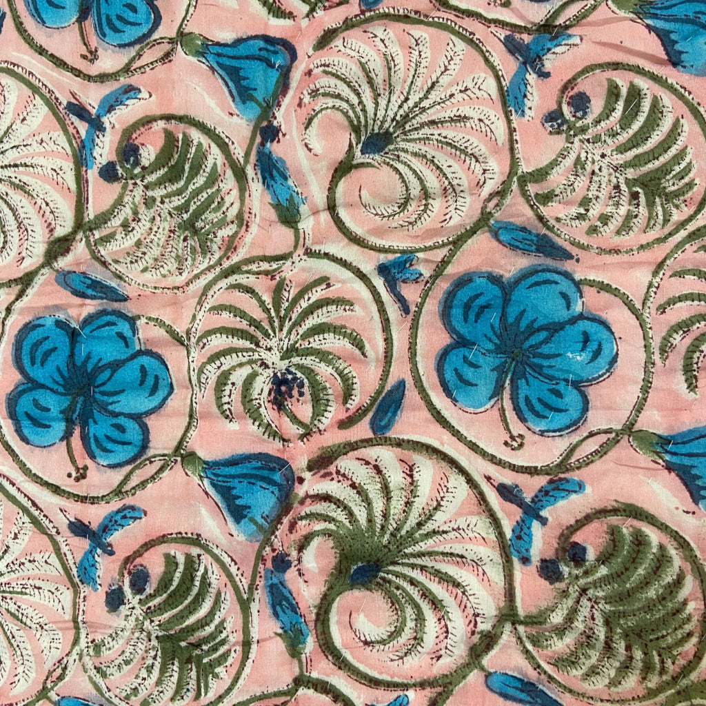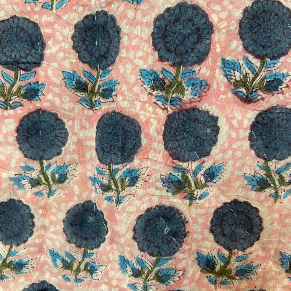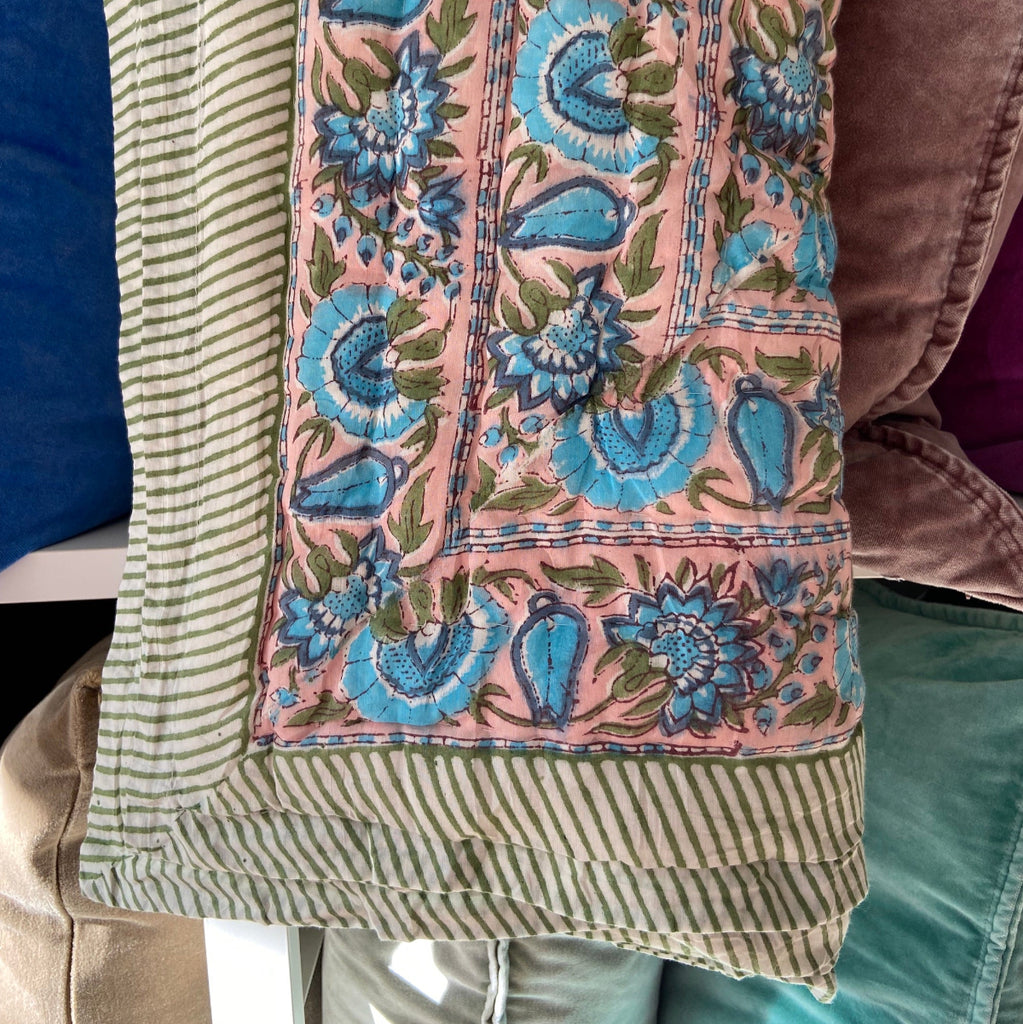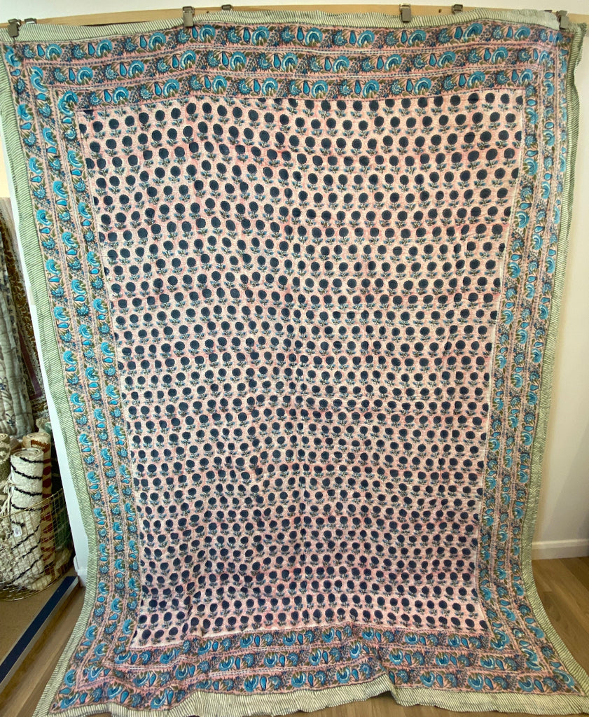 Product Details: 100% Cotton Voile outer and Cotton wadding filling. Hand stitched, hand block printed quilt.