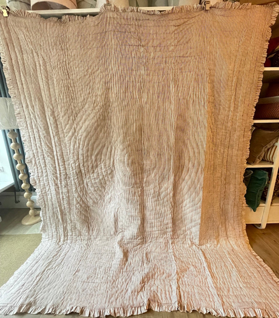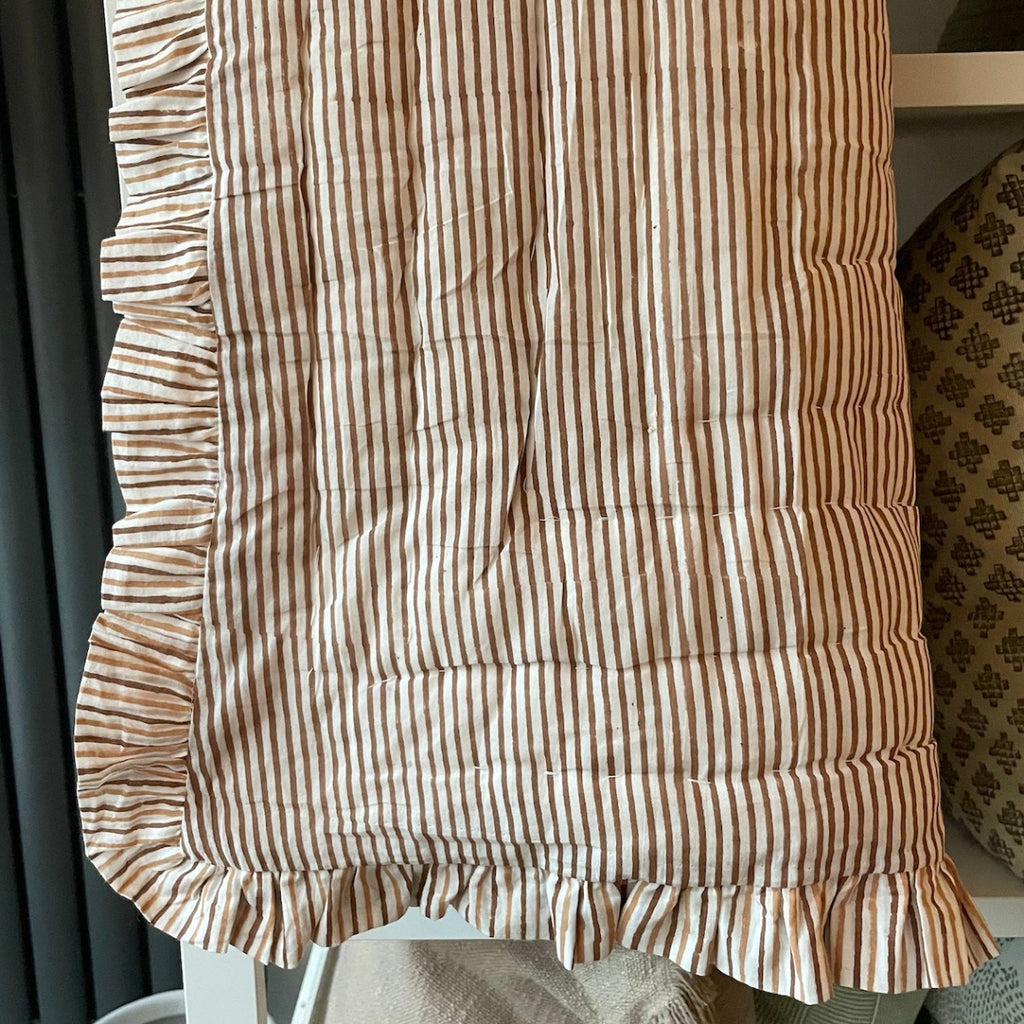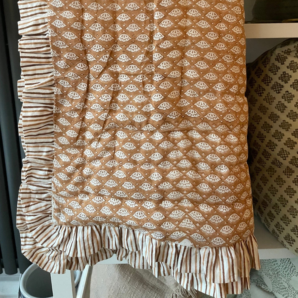 Product Details: 100% Cotton Voile outer and Cotton wadding filling. Hand stitched, hand block printed quilt.