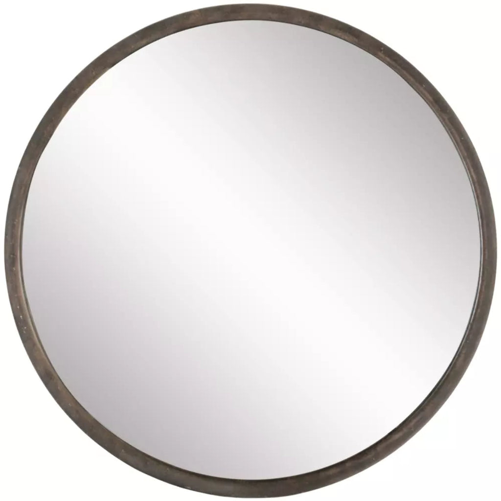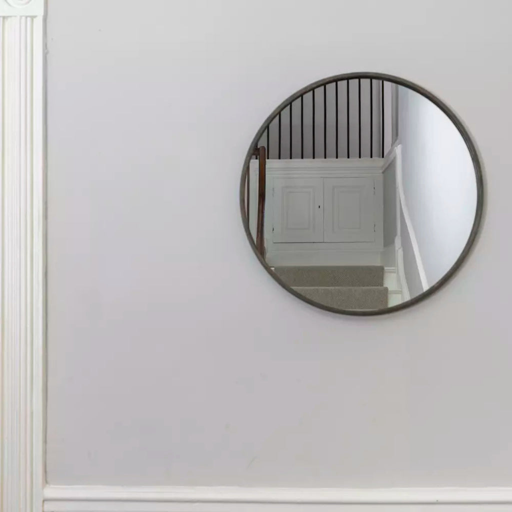 Pretty round metal framed mirror with a vintage grey metal finish giving the frame an aged feel and a timeless look.